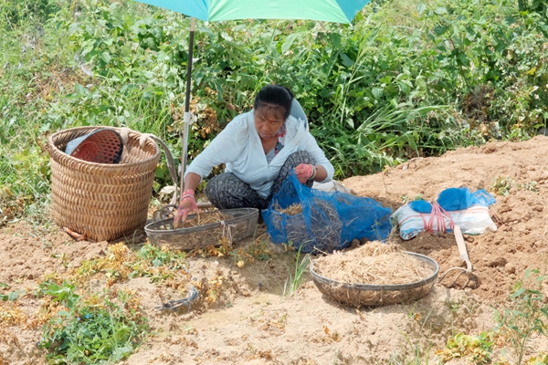 沿著田埂走去,泥土的清香混著藥材甘洌撲面而來。50多名村民散布其間,或蹲或坐,小鋤頭上下翻飛,一簇簇金黃飽滿、肥碩有人的太子參“嘩啦啦”躍出地面,像撒了一地的碎金。抖土、分揀、碼筐,動作一氣呵成,竹筐很快堆成小山。