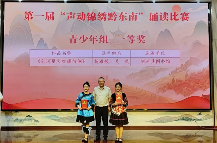 經(jīng)過(guò)緊張激烈的角逐,最終劍河縣圖書(shū)館選送的組合選手楊雅媛、吳羨帶來(lái)的作品《劍河星火紅耀苗侗》勇奪青少年組一等獎(jiǎng);凱里市圖書(shū)館選送的選手何萬(wàn)麗誦讀的作品《雪落在中國(guó)的土地上》獲得成人組一等獎(jiǎng)。此次誦讀比賽的成功舉辦,不僅為全州廣大誦讀愛(ài)好者提供了展示自我的舞臺(tái),而且有力地推動(dòng)了民族精神的弘揚(yáng)與傳承,對(duì)全民閱讀的深入推廣具有重要意義。