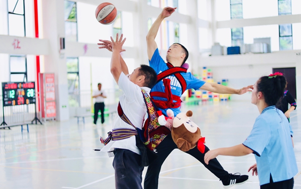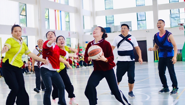 隨著裁判一聲哨響,這場融合體育競技與民族文化的友誼賽正式拉開帷幕。女教師們憑借靈活的步伐和默契配合,在苗族服飾的映襯下更顯颯爽英姿;男教師們則背著“小寶貝”奮力奔跑,既要護(hù)住洋娃娃又要爭搶籃球,滑稽動(dòng)作引得全場笑聲不斷,現(xiàn)場掌聲與歡呼聲此起彼伏。
