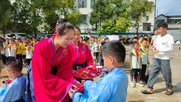 “看著孩子們用稚嫩的小手握住毛筆,一筆一畫地寫下‘人’字,希望孩子們以后能像這個‘人’字一樣,腳踏實地、頂天立地,做一個正直、善良、有擔(dān)當(dāng)?shù)娜??!瘪R號鎮(zhèn)中心小學(xué)校長龍昌金說。