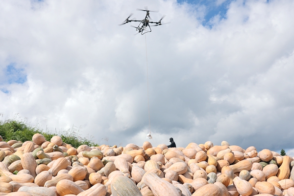 在貴州省黔東南苗族侗族自治州榕江縣栽麻鎮(zhèn)南瓜種植基地,一袋袋南瓜“搭乘”無人機(jī),在飛手的操作下翻山越嶺,飛躍山脊,精準(zhǔn)降落在山腳公路旁,裝車供應(yīng)市場。