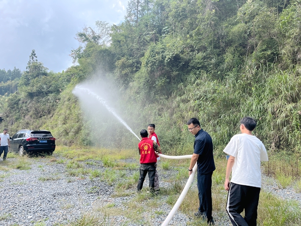 演練一開始,韋承召先把常用的消防安全知識和消防器材深入淺的給大伙講解,讓大家對安全防火有一定的認識和見解。緊接著就開展現(xiàn)場抽水泵教學,韋承召直接把機器搬到溪邊,教大家先檢查機器,“先看機油,就像給摩托車添油一樣,油尺擦干凈插進去,油跡在綠線中間才正好,少了會燒機器。” 他邊說邊把機油尺拔出來給大家看,還讓村民楊光雄上手試了試,“摸著手感才記得牢!” 接著教接水管:“進水管一頭放水里,另一頭擰在泵體‘進水’接口,得擰三圈以上才緊;出水管接‘出水’口,再打開排氣閥,等有水冒出來就關(guān)閥?!卑聪聠娱_關(guān),“嗡嗡嗡” 的機器聲響起,清澈的溪水順著出水管 “嘩嘩” 流出來,大伙們頓時鼓起掌。