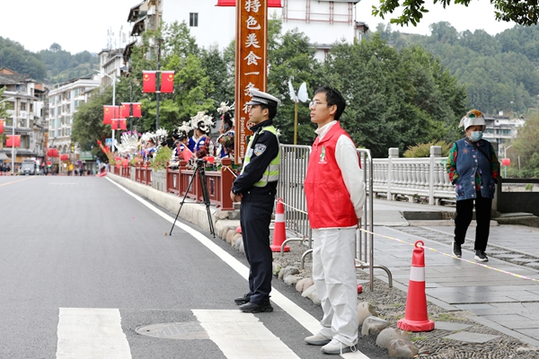賽事期間,民輔警不僅是安全守護(hù)者,更是暖心服務(wù)者。面對觀賽群眾較多的情況,民輔警及時引導(dǎo)村民在安全區(qū)域為選手吶喊助威,提醒帶孩子的家長注意防護(hù);當(dāng)發(fā)現(xiàn)有選手出現(xiàn)體力不支等情況時,立即通過對講機(jī)呼叫周邊醫(yī)療組開展緊急處置,用高效協(xié)作贏得選手點(diǎn)贊。賽道旁,身著藏青藍(lán)的民輔警與身著銀飾苗裝的村民相映成趣,一邊是嚴(yán)謹(jǐn)值守的安全防線,一邊是熱情助威的鄉(xiāng)土溫情,共同構(gòu)成賽事中一道兼具安全感與煙火氣的獨(dú)特風(fēng)景線。