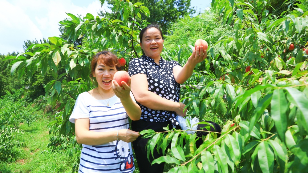 與此同時,桃園也迎來了不少游客,他們興致勃勃地挑選心儀的桃子,咬上一口清脆香甜,沁人心脾。一邊采摘,一邊欣賞景色、打卡拍照,歡聲笑語間,圓滾滾的桃子便落入袋中,個個滿載而歸。