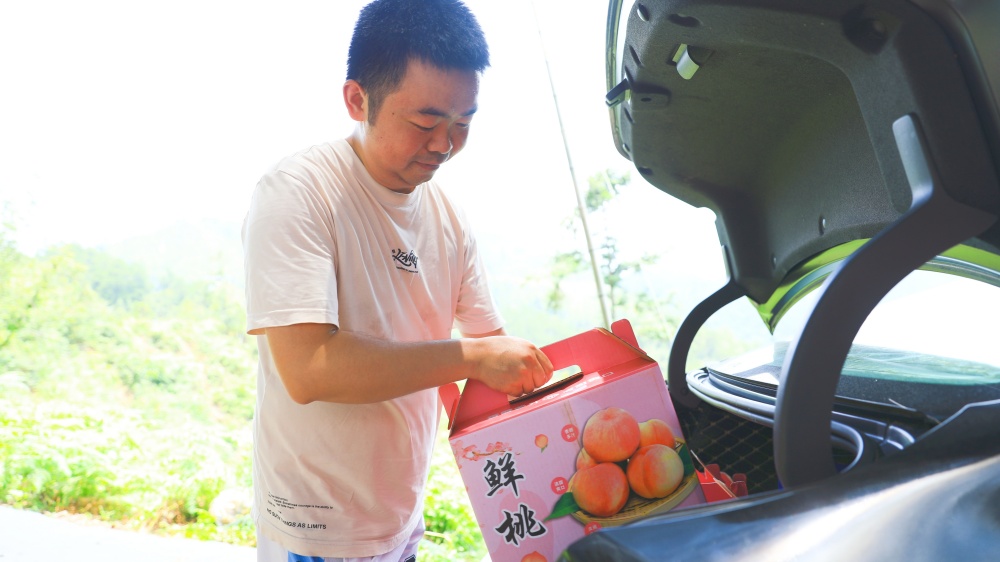 清晨,山風徐徐,桃園里已是熱火朝天。紅彤彤的桃子掛滿枝頭,個個飽滿圓潤,表皮泛著誘人的光澤。村民們穿梭在桃樹間,忙碌而有序地采摘著成熟的桃子,隨后熟練地進行分揀、打包,搶“鮮”將這份“甜蜜”通過快遞送到訂購顧客的手中?!斑@些紅桃中午就能發(fā)出去,像貴陽、凱里這些近的地方,晚上顧客就能嘗到最新鮮的。”村民萬皓敏小心地將剛采摘的桃子打包。