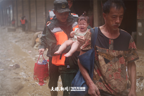另一張照片中,三名戰(zhàn)士托舉著一個(gè)襁褓,在齊胸的洪水中艱難前行;他們身后是逐漸上漲的洪水,身前是通往希望的生路。