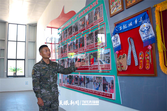 8月1日,陽光透過玻璃,在武警貴州總隊(duì)黔東南支隊(duì)某中隊(duì)訓(xùn)練營的文化墻上投下斑駁光影,戰(zhàn)士海曉龍指著一張泛光的照片,興奮地拽著身旁的戰(zhàn)友李東輝。