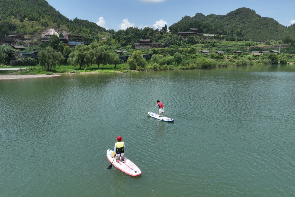 這座由貴州行者原鄉(xiāng)商業(yè)管理有限公司與卡烏村共建的“玩水天堂”,依托清水江平緩清澈的水域,開發(fā)了槳板漂流、皮劃艇、夜光泳池等多項(xiàng)親水項(xiàng)目,單日最高接待游客量近千人次。