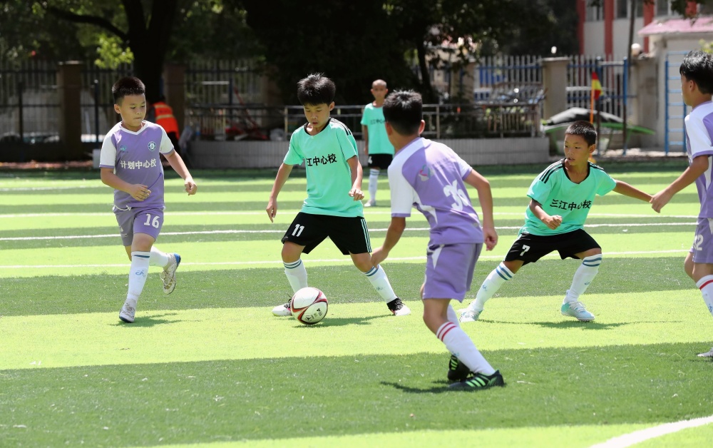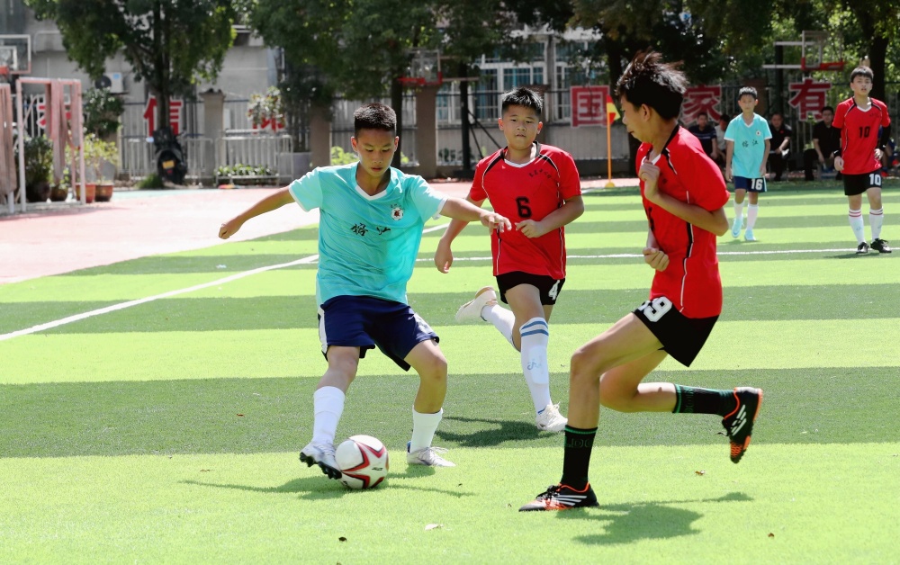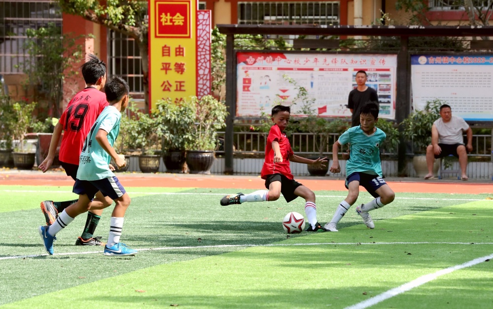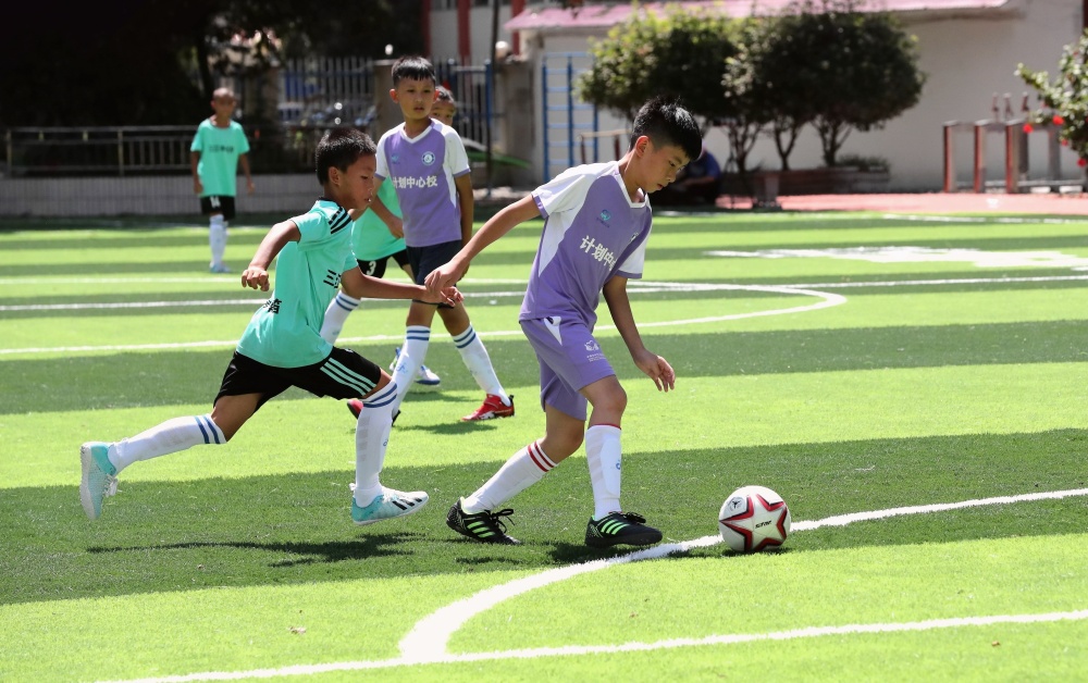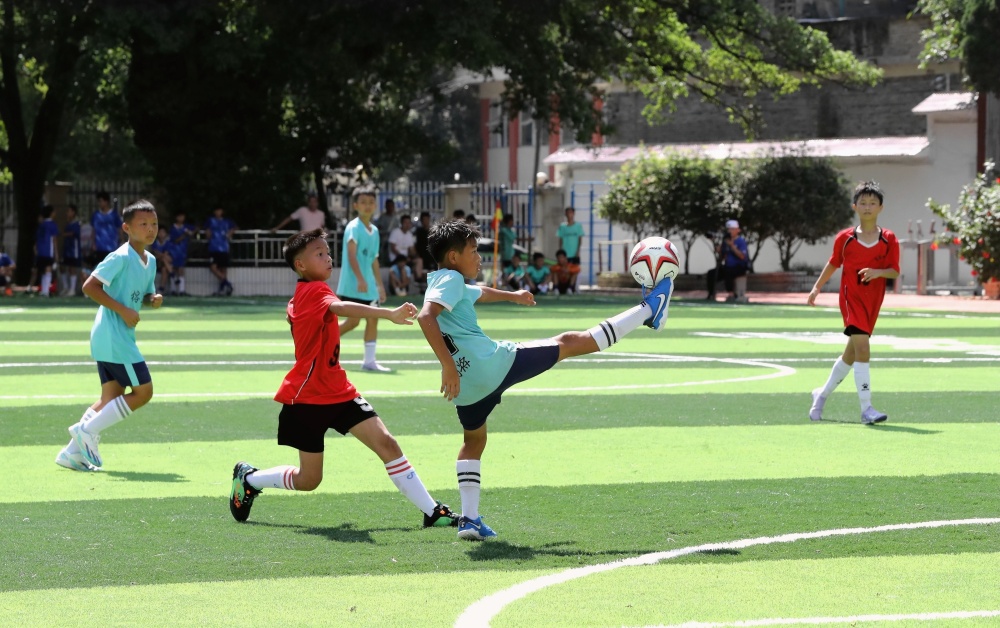 8月16日,在貴州省黔東南苗族侗族自治州榕江縣古州鎮(zhèn)第一小學(xué)足球場,古州鎮(zhèn)第二小學(xué)“班超”球員(藍(lán)衣)與寨蒿鎮(zhèn)中心?!鞍喑鼻騿T在賽場上拼搶。