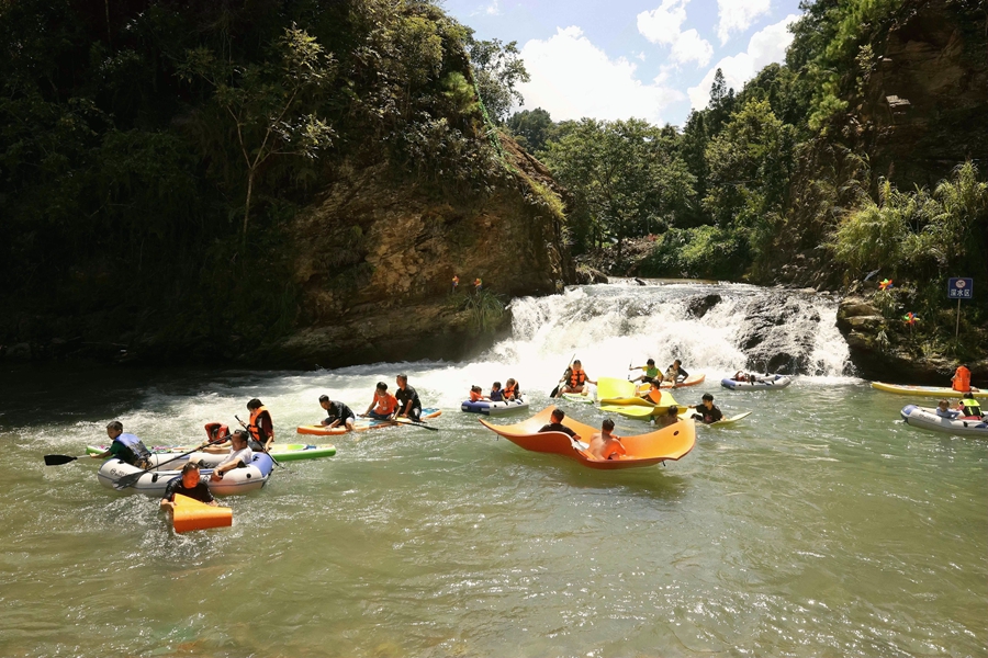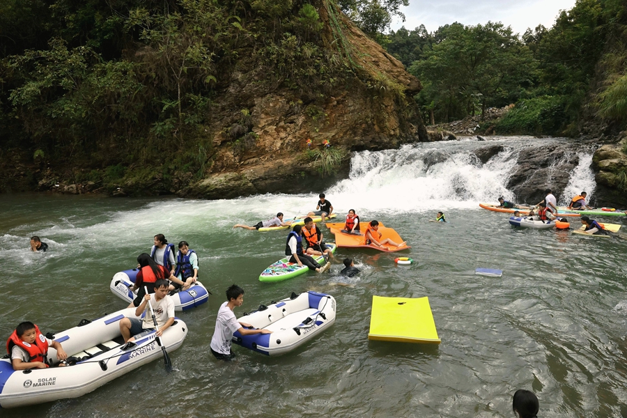 榕江縣水尾鄉(xiāng)水尾村月亮灣,游客參與水中游玩、摸螺螄比賽、抓魚比賽、抓鴨比賽、水上拔河、水族文化展示等,讓游客沉浸式享歡樂。