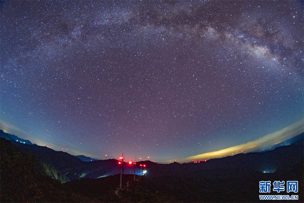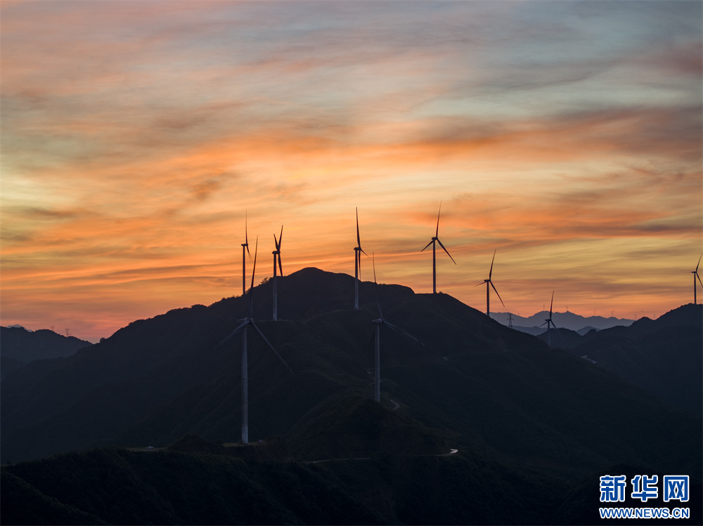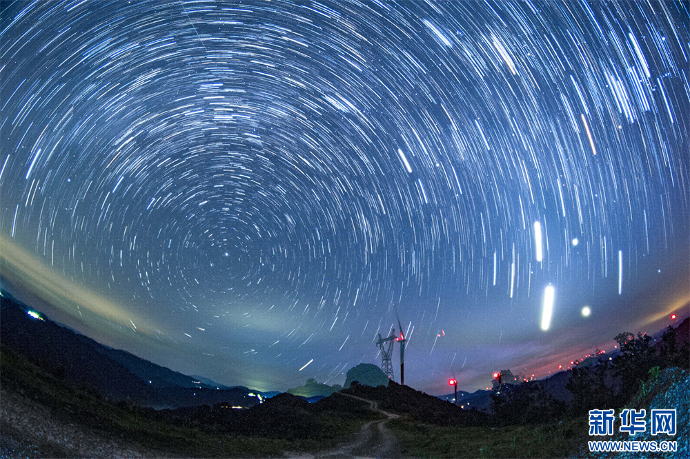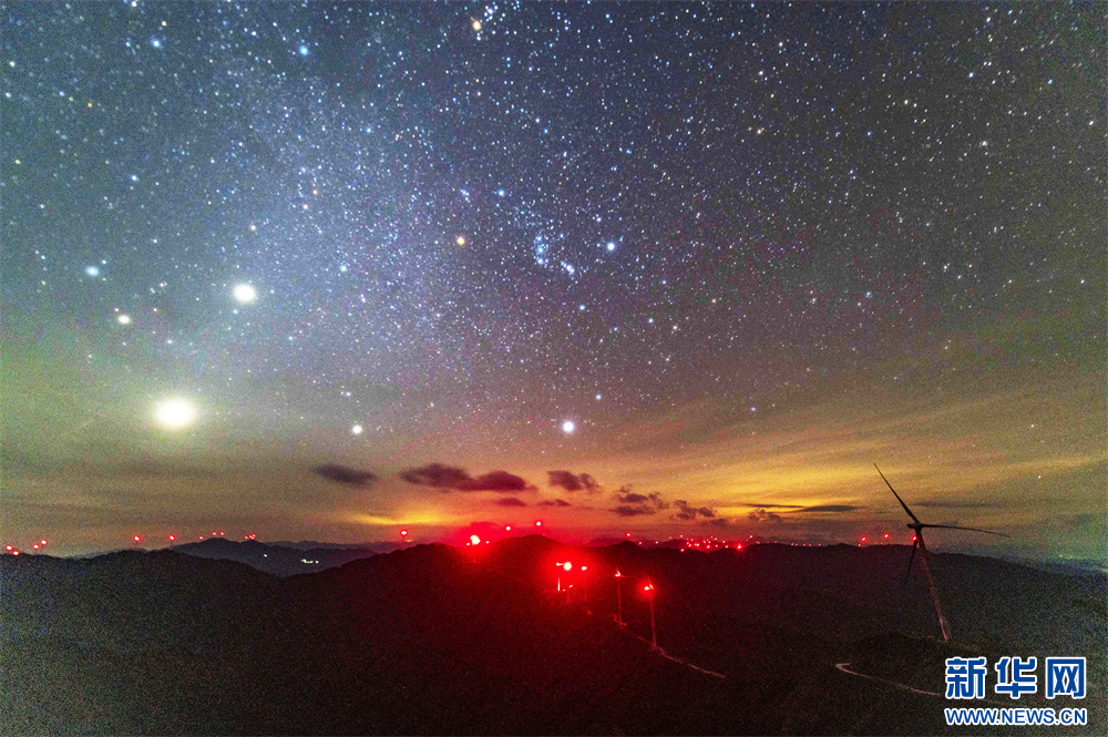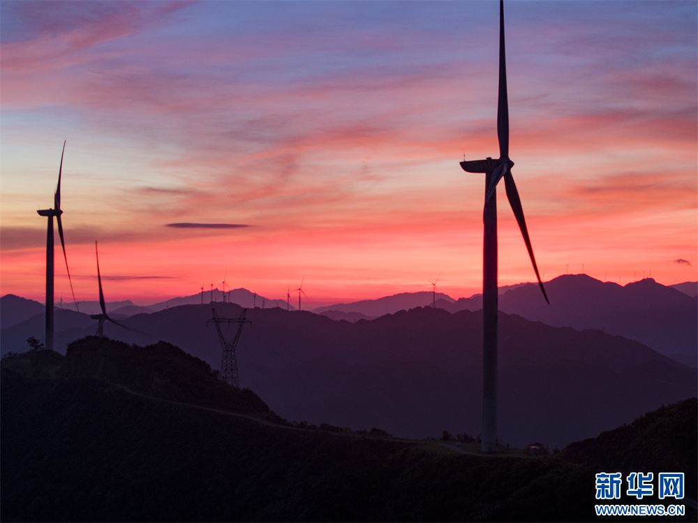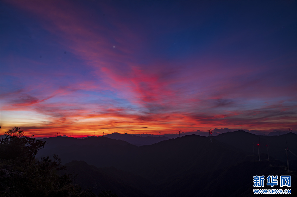 初秋時(shí)節(jié),貴州省從江縣加榜鄉(xiāng)達(dá)棒山風(fēng)電場(chǎng)夜空澄澈,星河璀璨,朝霞如畫,與山脊上聳立的風(fēng)力發(fā)電機(jī)組構(gòu)成一幅幅美麗畫卷。
