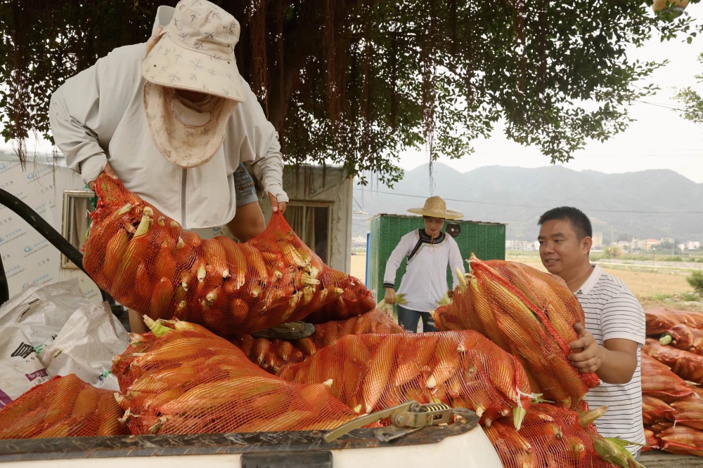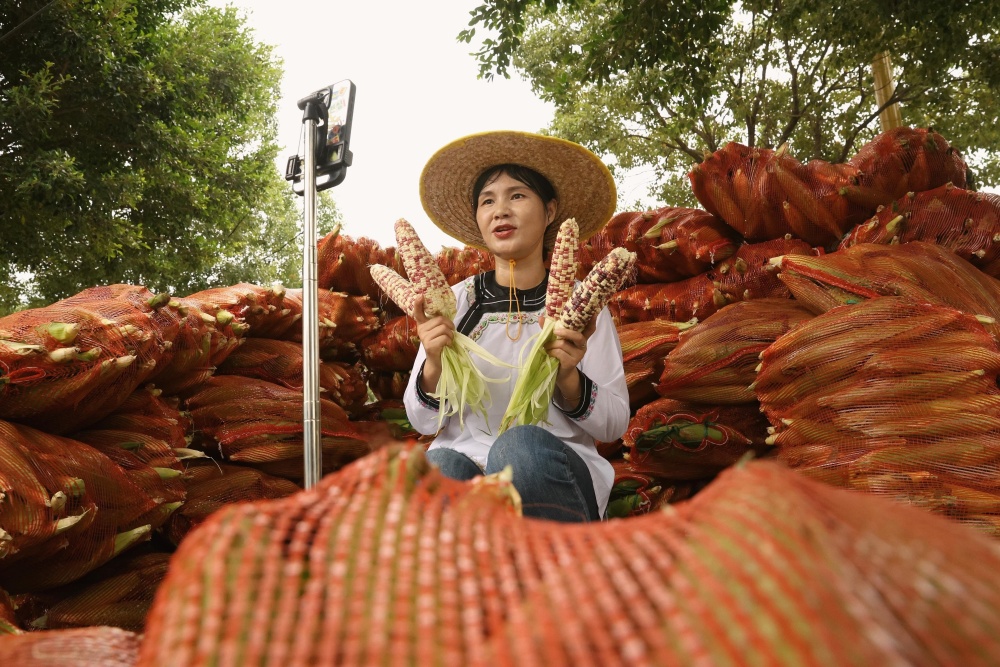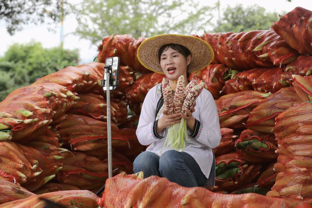 9月7日,在貴州省黔東南苗族侗族自治州榕江縣古州鎮(zhèn)車江大壩玉米種植基地,鄉(xiāng)村主播在為農(nóng)民直播推銷玉米。