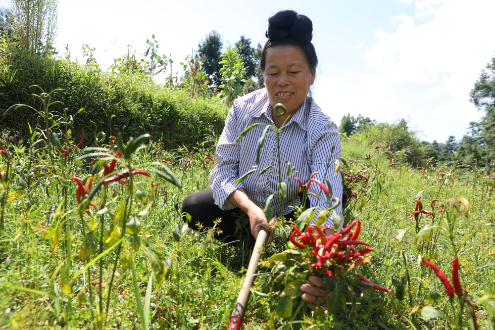 走進(jìn)久仰鎮(zhèn)畢下村村民姜圣的辣椒地,枝丫間綴滿的朝天椒鮮紅飽滿。他挎著竹籃,手持剪刀,小心翼翼地將成熟的辣椒剪入筐中。