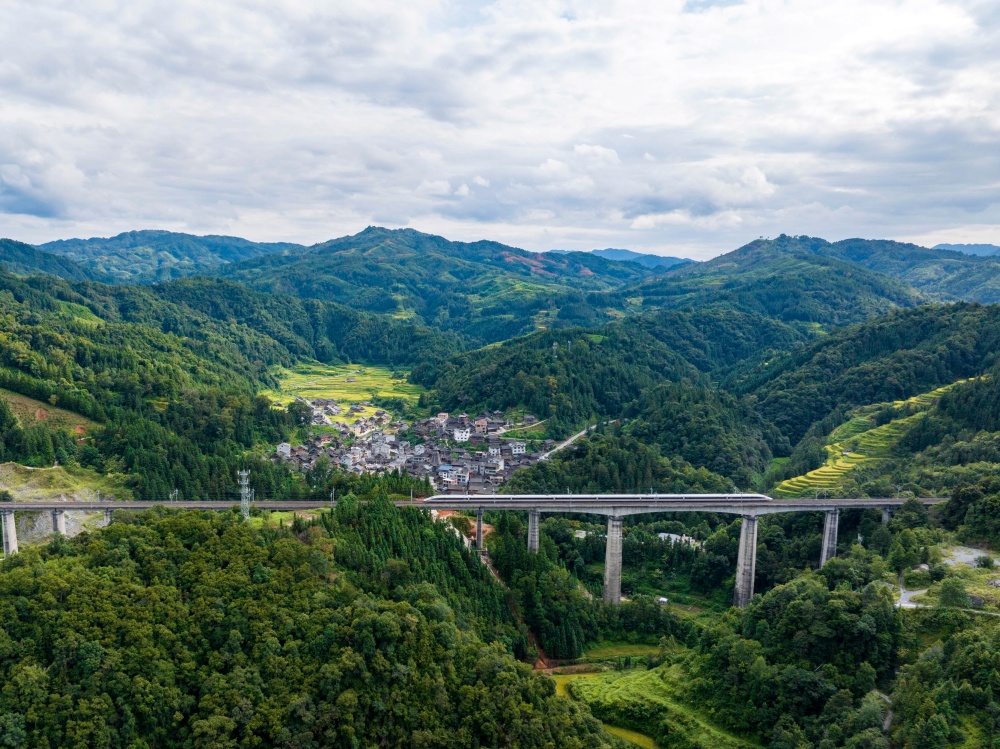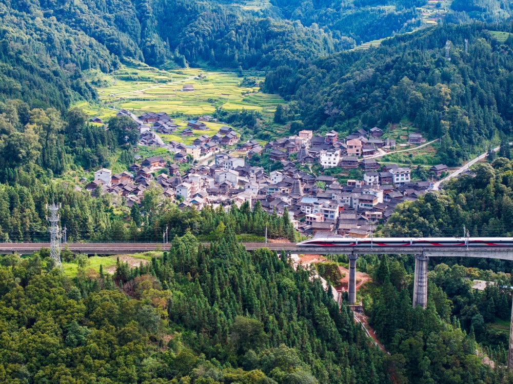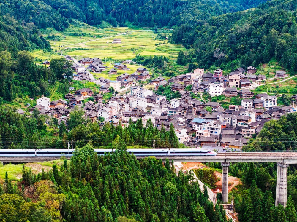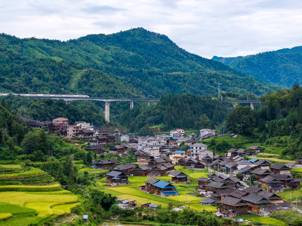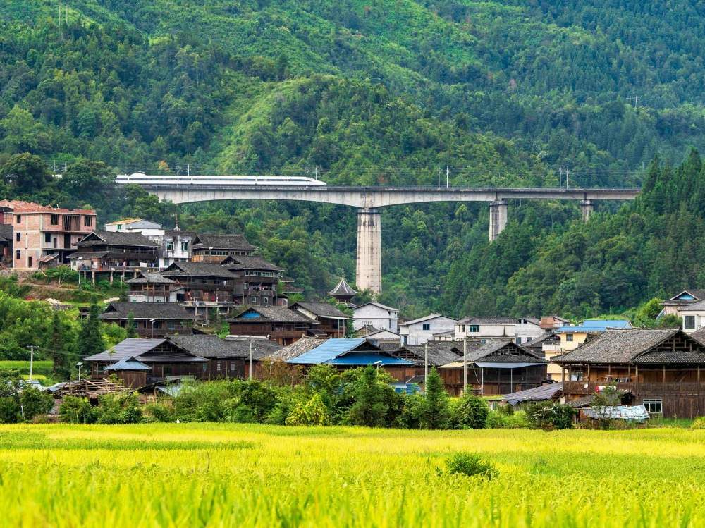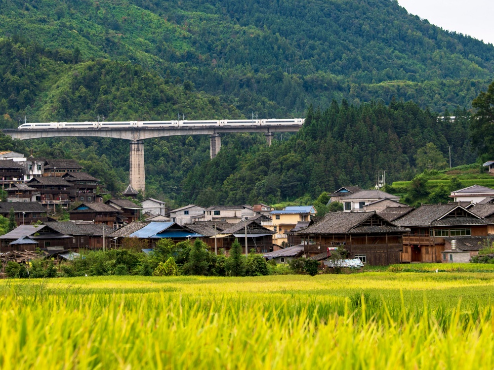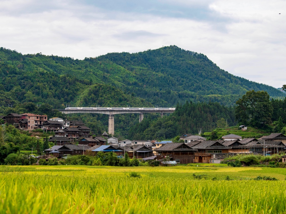 金秋時節(jié),貴州省黔東南苗族侗族自治州從江縣境內(nèi)的水稻陸續(xù)成熟,大地鋪金。一列列動車組飛速疾馳的列車經(jīng)過,與金黃色的稻田、傳統(tǒng)的侗寨民居、連綿的青山相互映襯,構(gòu)成一幅動人的秋日畫卷。