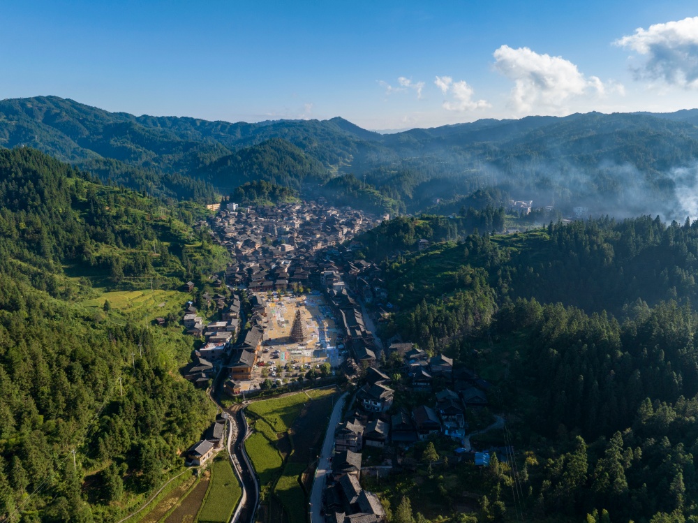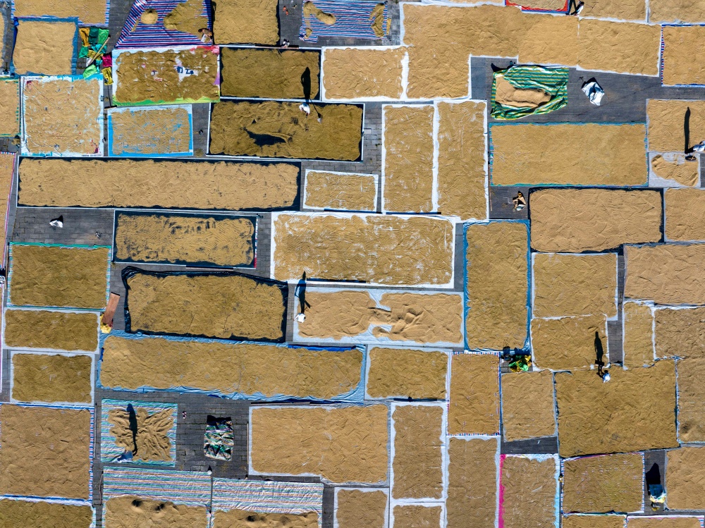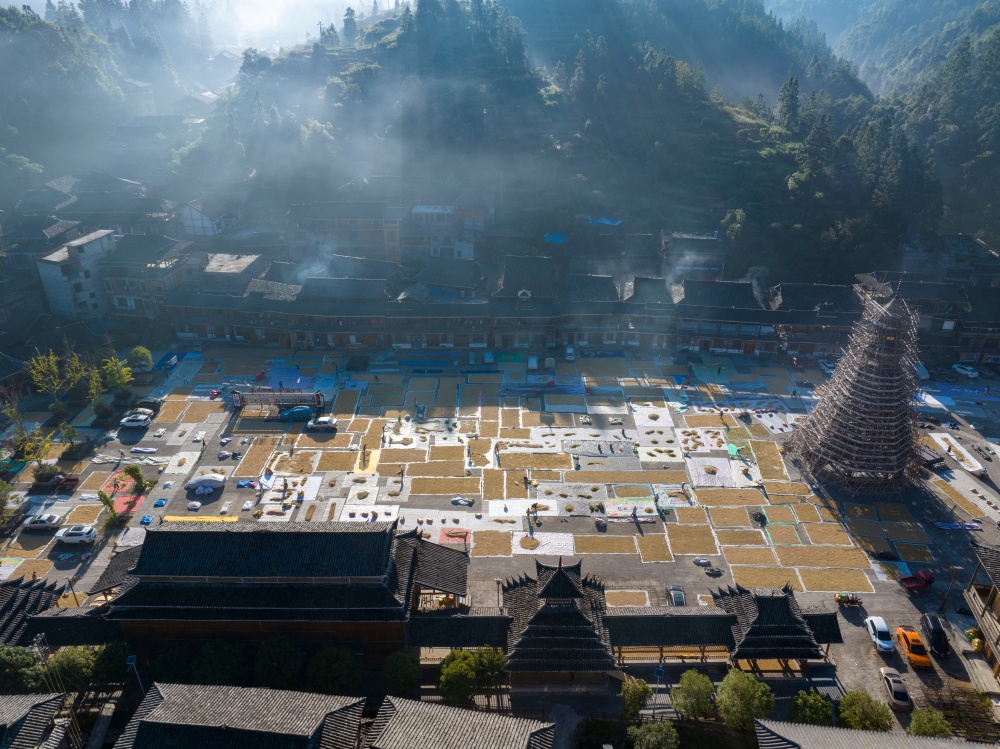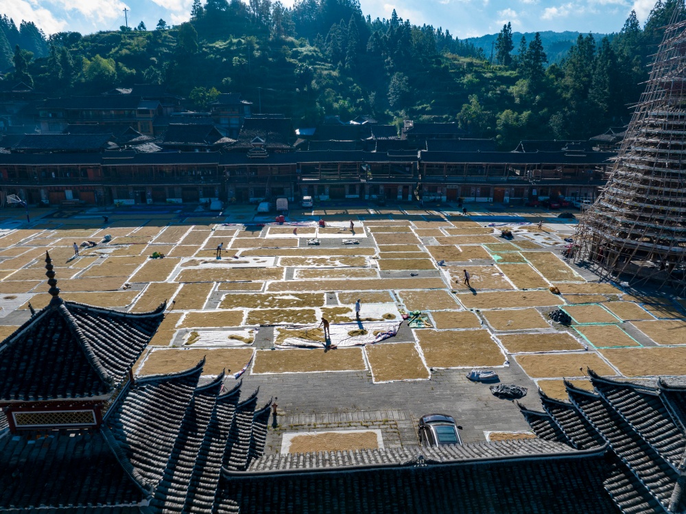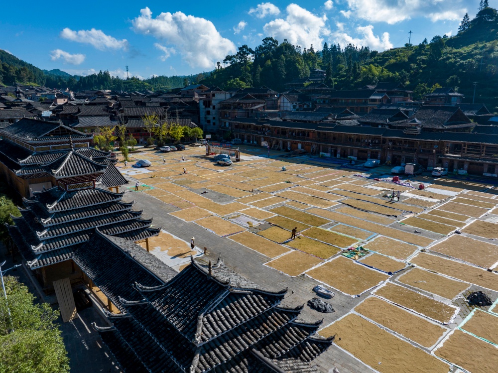 9月17日,貴州省從江縣高增鄉(xiāng)小黃侗寨村民在廣場上晾曬稻谷(無人機照片)。