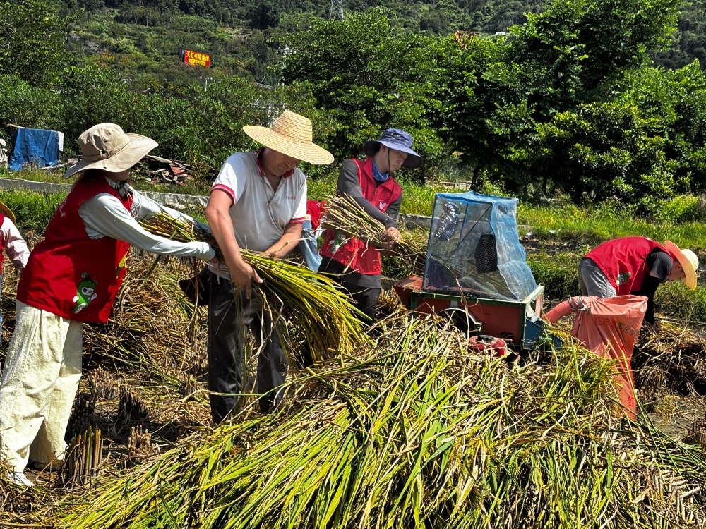 活動(dòng)中,志愿者們統(tǒng)一身著“小青椒”紅色馬甲,自起初學(xué)習(xí)收割技巧到后期分工協(xié)作,迅速融入勞動(dòng)節(jié)奏。他們穿梭于金黃的稻浪之間,與農(nóng)戶并肩協(xié)作,有序開展水稻收割、脫粒及運(yùn)輸?shù)拳h(huán)節(jié)。有人彎腰揮鐮,動(dòng)作逐漸熟練;有人操作打谷機(jī),節(jié)奏分明;還有人負(fù)責(zé)捆扎和搬運(yùn),一派繁忙而和諧的豐收景象。