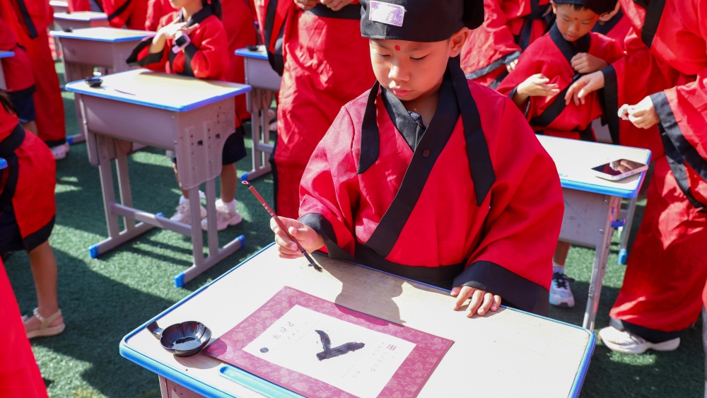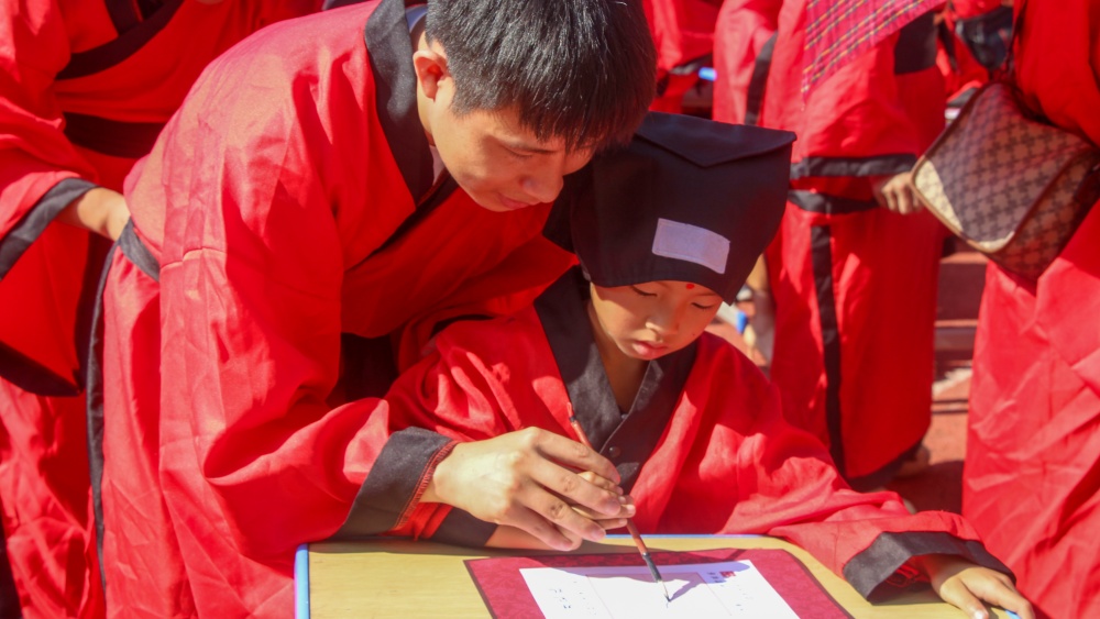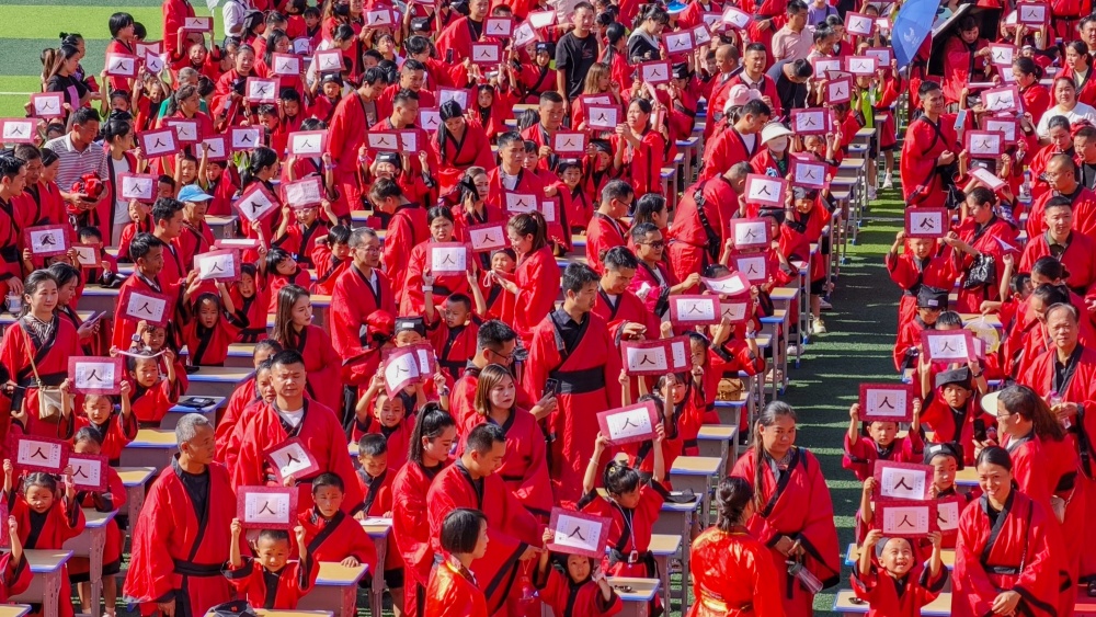 儀式現(xiàn)場環(huán)節(jié)豐富且寓意深刻,涵蓋“正衣冠”“朱砂啟智”“擊鼓明志”“誦讀《弟子規(guī)》”“啟蒙描紅”“感恩行禮”等環(huán)節(jié)。學校領導與教師為每一位學子點朱砂,啟童智;指導書寫簡單而深刻的“人”字,寄意端正做人、踏實做事。整個過程融禮儀教育與文化啟蒙于一體,使學生在實踐中感悟尊師重道、明理修身的傳統(tǒng)價值。