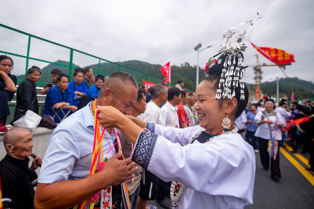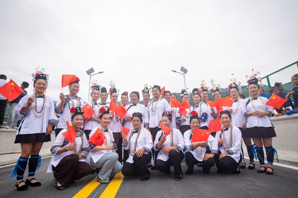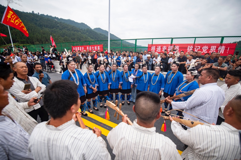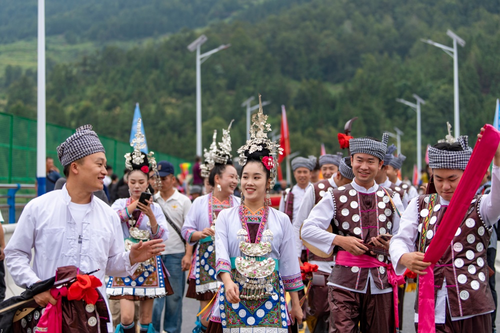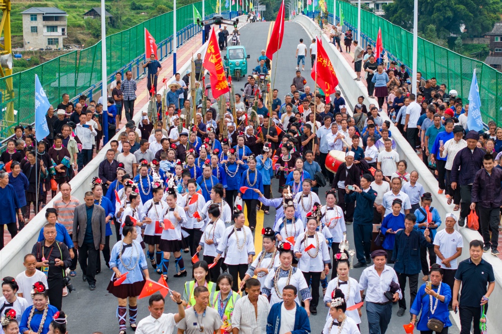 9月22日,在貴州省從江縣下江鎮(zhèn)孖溫村,苗侗同胞在孖溫大橋載歌載舞歡慶大橋通車。