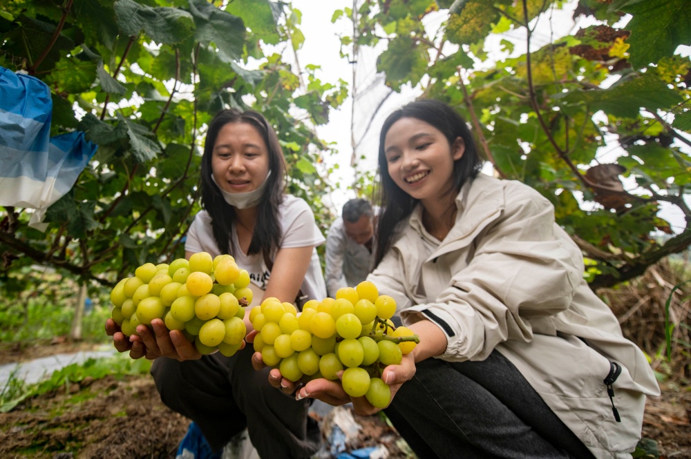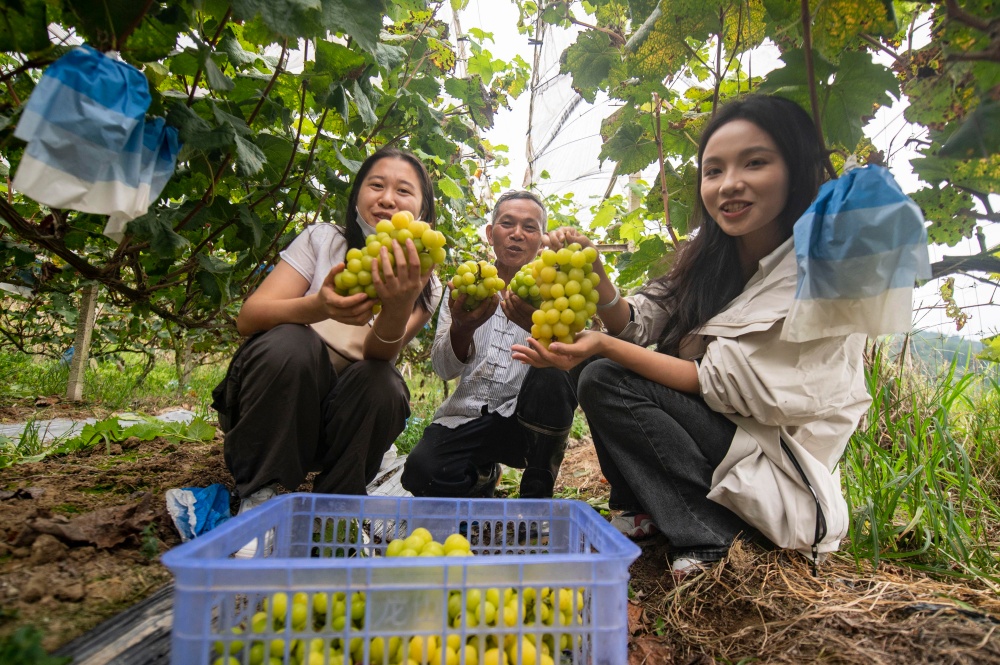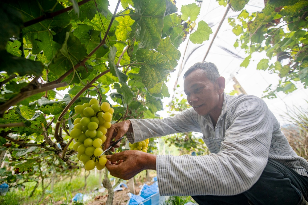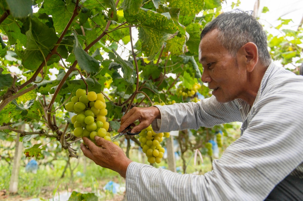 9月22日,在貴州省從江縣下江鎮(zhèn)巨洞村,村民在采摘成熟的“陽光玫瑰”葡萄。