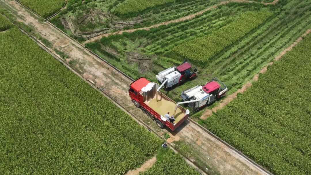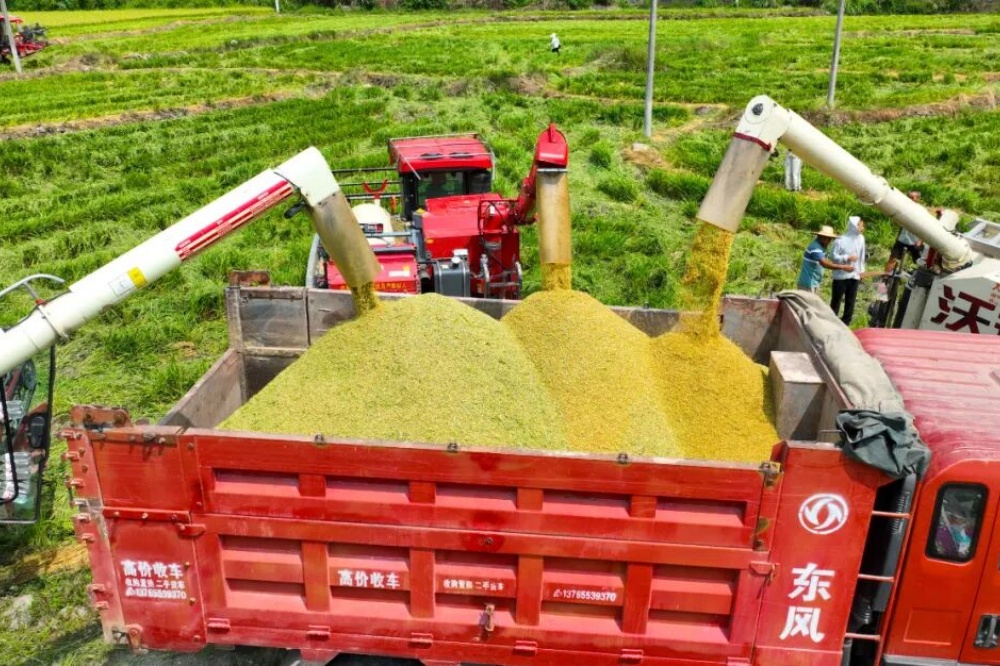 在大有鎮(zhèn)臘恰畈村水稻制種基地里,金黃的稻田里,高性能收割機開足馬力,高效地進行切割作業(yè),收割下來的稻谷通過傳送裝置直接裝入??吭谔锕∨缘倪\輸貨車車廂內(nèi),實現(xiàn)了“機收即運”,有效避免了谷物長時間堆放可能造成的品質(zhì)下降問題,確保了稻谷的新鮮度和品質(zhì)是推動農(nóng)業(yè)現(xiàn)代化、提升農(nóng)業(yè)效益的重要舉措。
