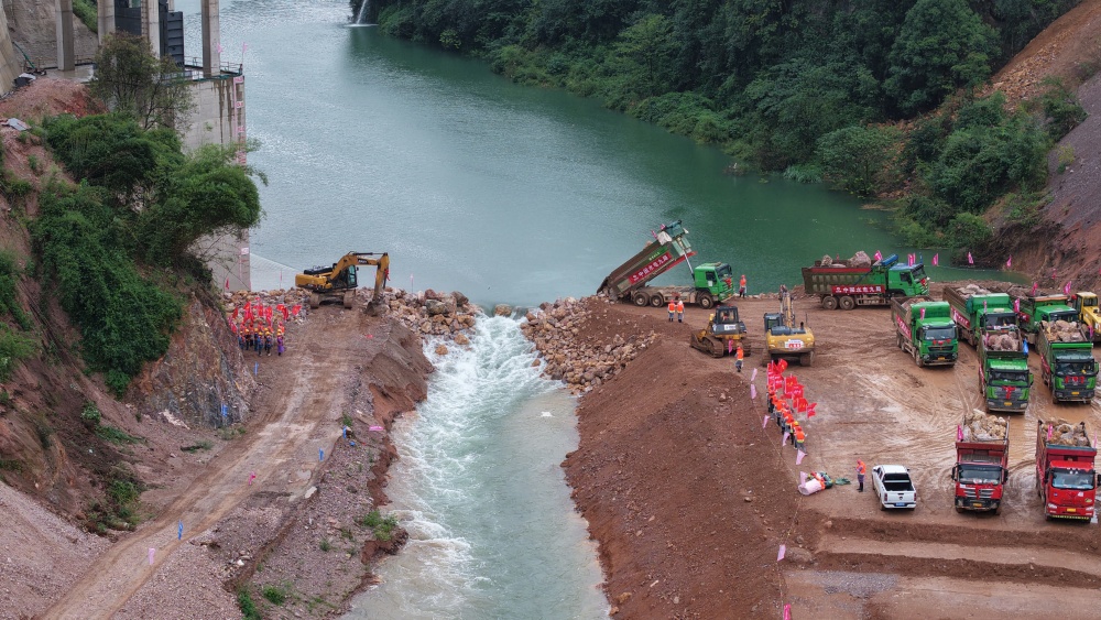 當天上午,在宣威水庫大壩進行截流,自卸車將土石方等拋投材料傾瀉到清水江中,很快清水江被截斷河水經右岸導流洞下泄。