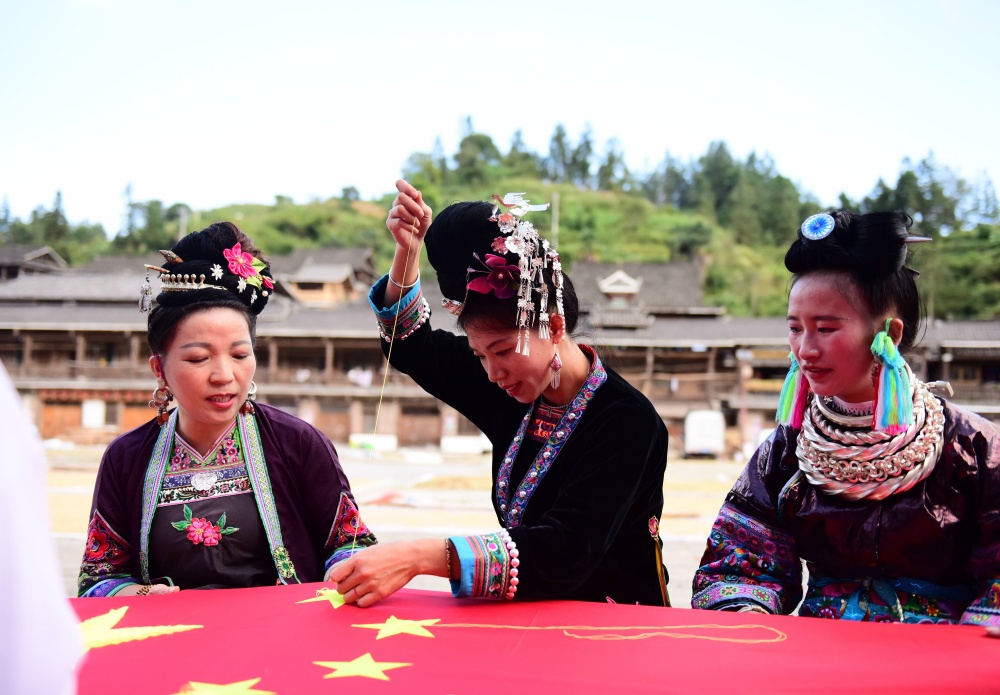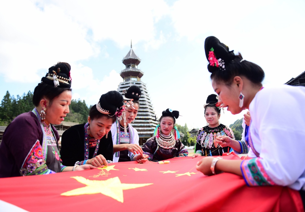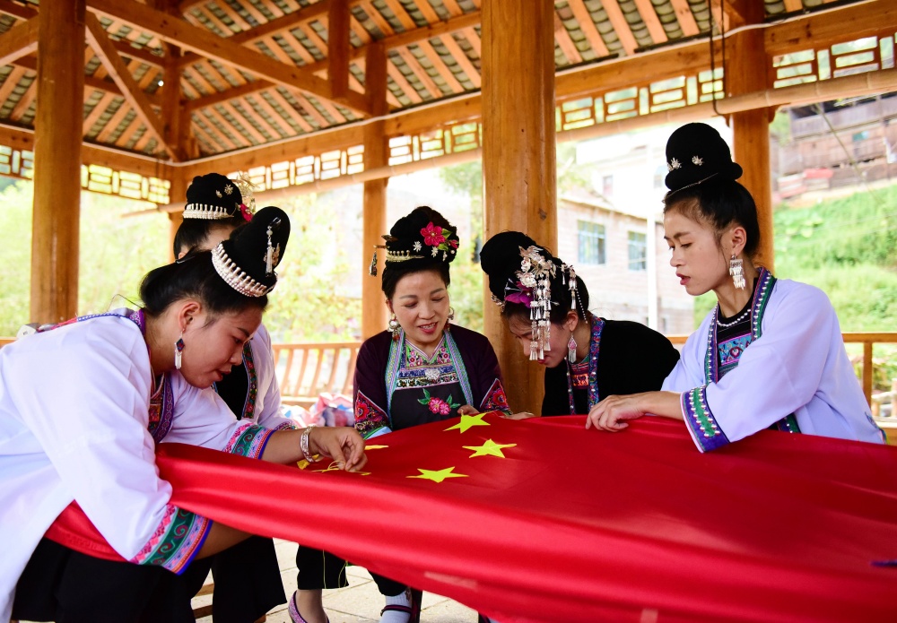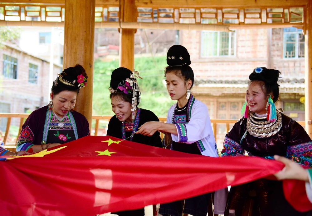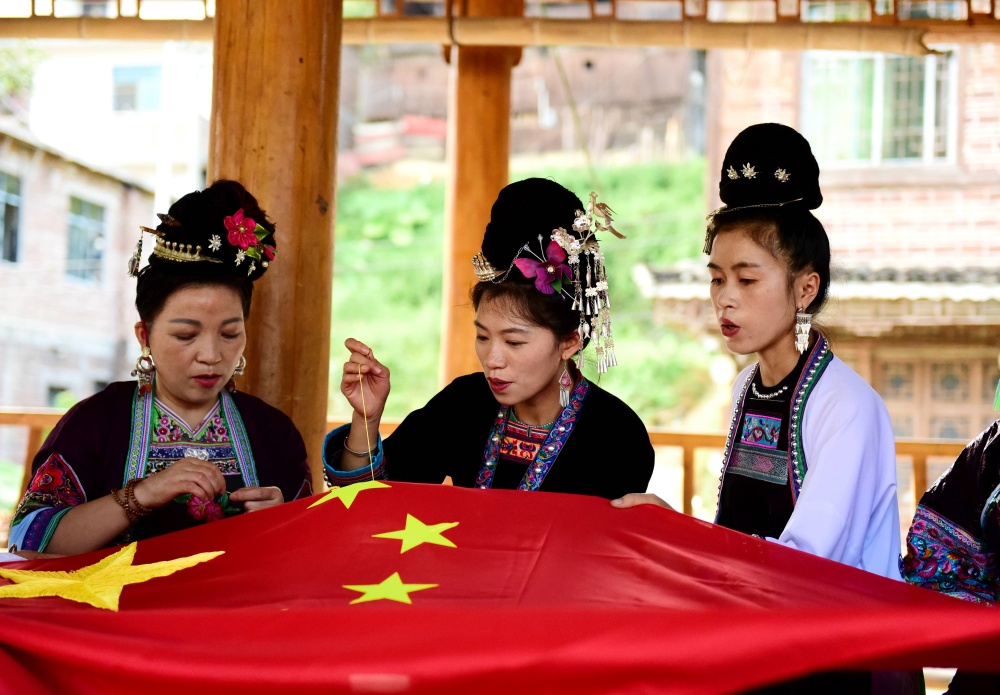 9月27日,為慶祝新中國(guó)成立76周年,貴州省黔東南苗族侗族自治州從江縣高增鄉(xiāng)小黃村的繡娘們自發(fā)組織,通過(guò)開(kāi)展繡國(guó)旗、唱紅歌等活動(dòng),以抒發(fā)自己的愛(ài)國(guó)情懷,向偉大祖國(guó)獻(xiàn)上最真摯的祝福,喜迎國(guó)慶佳節(jié)的到來(lái)。