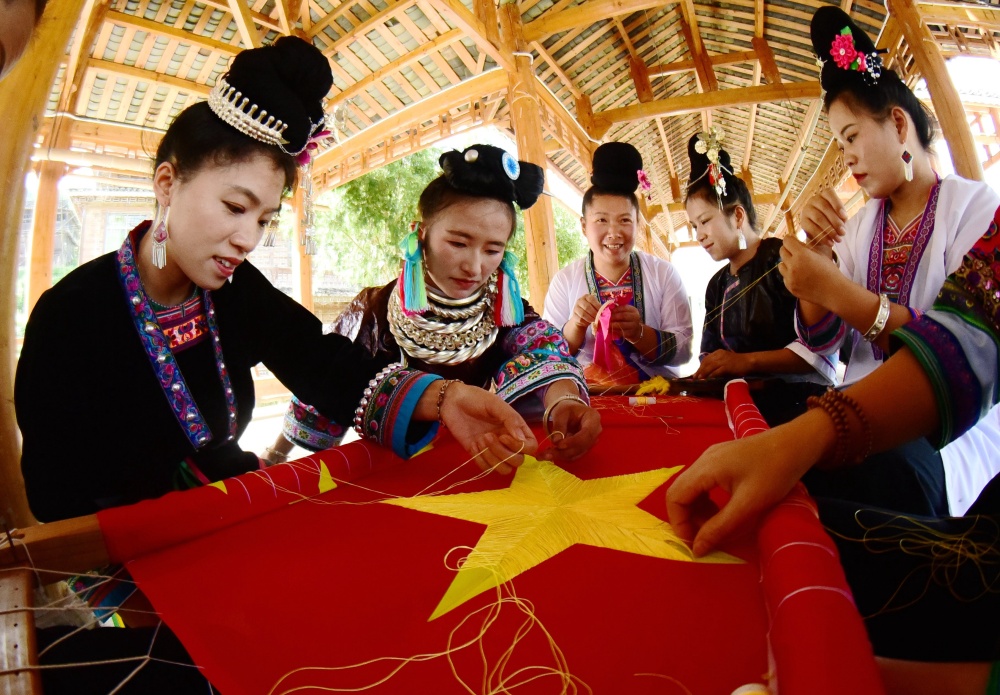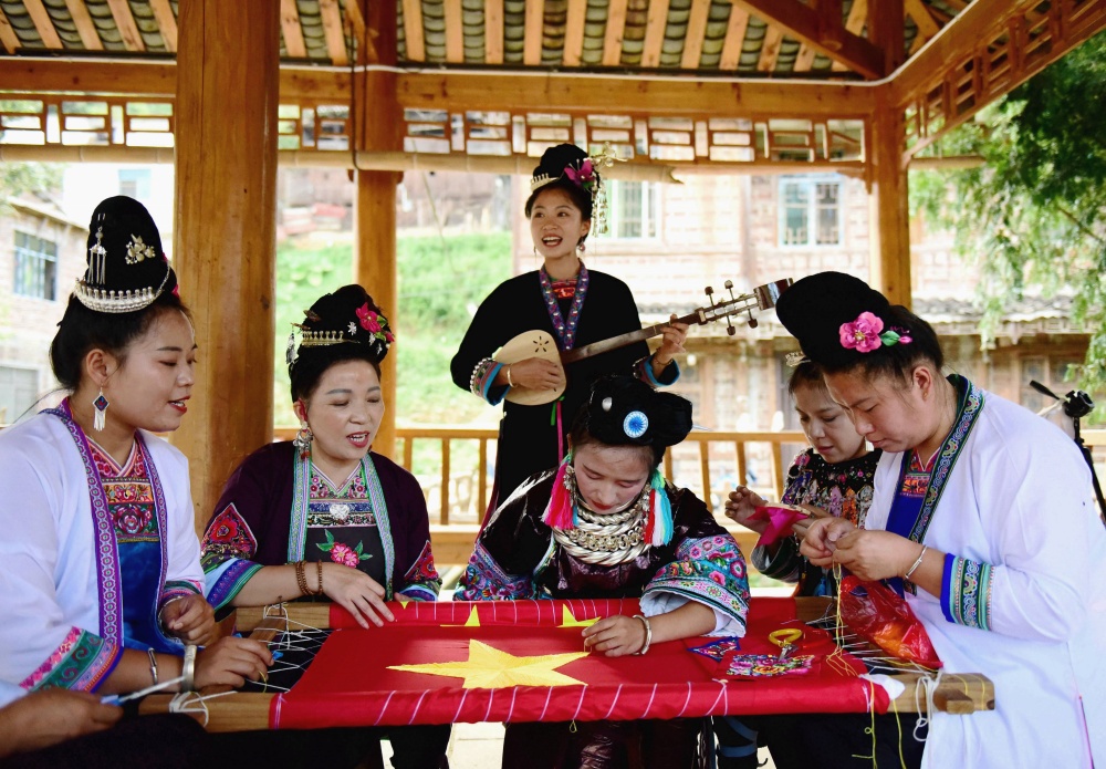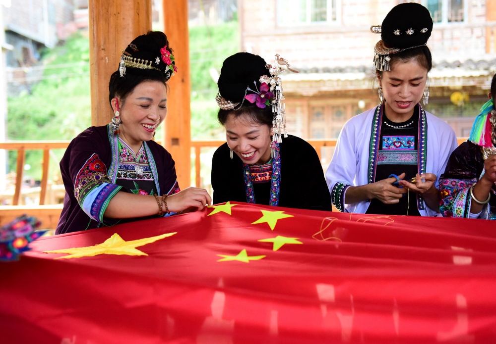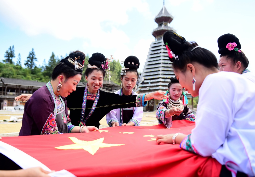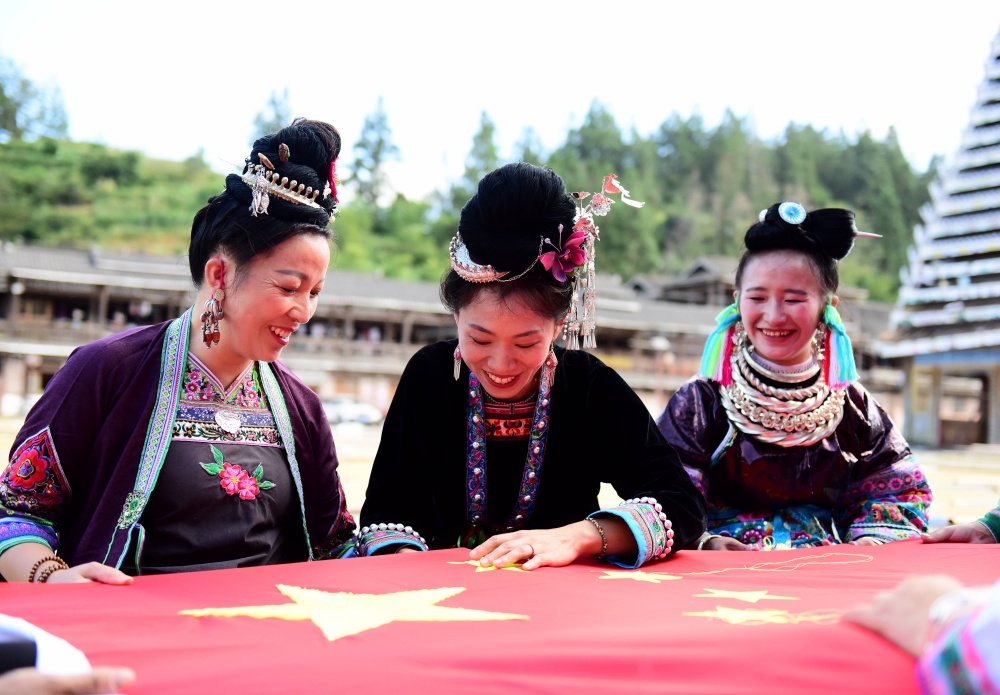 9月27日,為慶祝新中國(guó)成立76周年,貴州省黔東南苗族侗族自治州從江縣高增鄉(xiāng)小黃村的繡娘們自發(fā)組織,通過(guò)開(kāi)展繡國(guó)旗、唱紅歌等活動(dòng),以抒發(fā)自己的愛(ài)國(guó)情懷,向偉大祖國(guó)獻(xiàn)上最真摯的祝福,喜迎國(guó)慶佳節(jié)的到來(lái)。