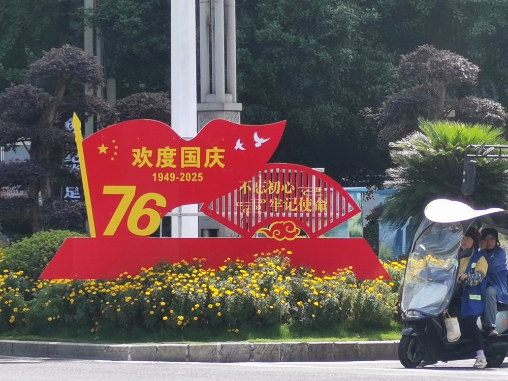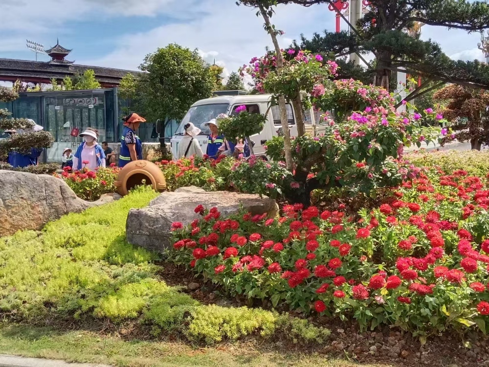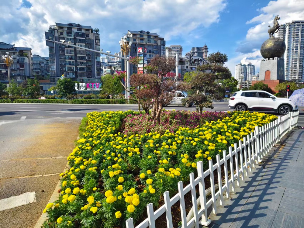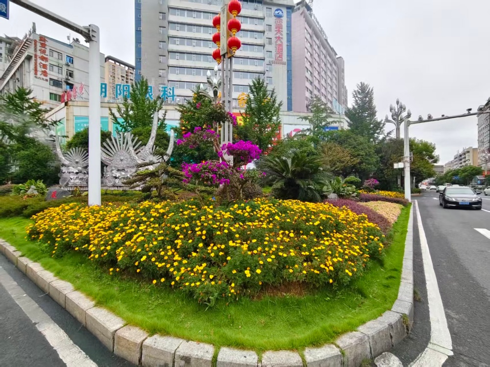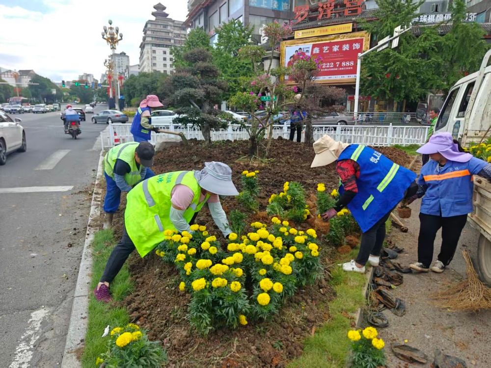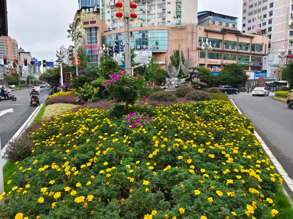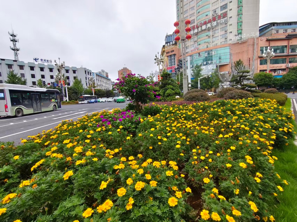 在大十字路口、萬博廣場(chǎng)、行政中心廣場(chǎng)等地,萬壽菊、千日紅、百日草等10000株色彩斑斕的花卉競(jìng)相綻放,與新增的3塊國慶主題展板相映成趣,提前點(diǎn)燃了節(jié)日的熱烈氣氛。