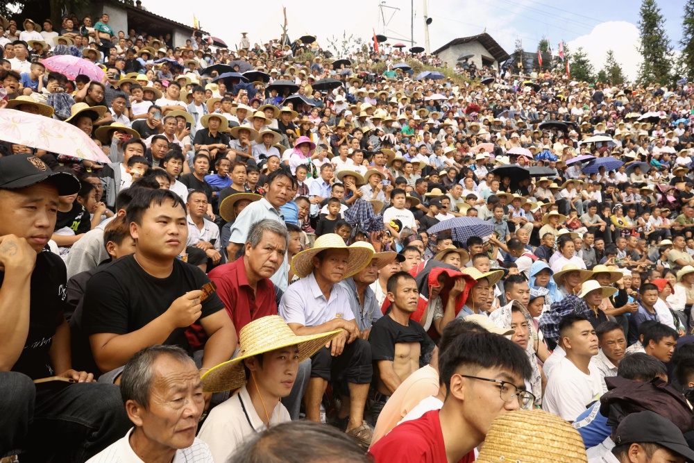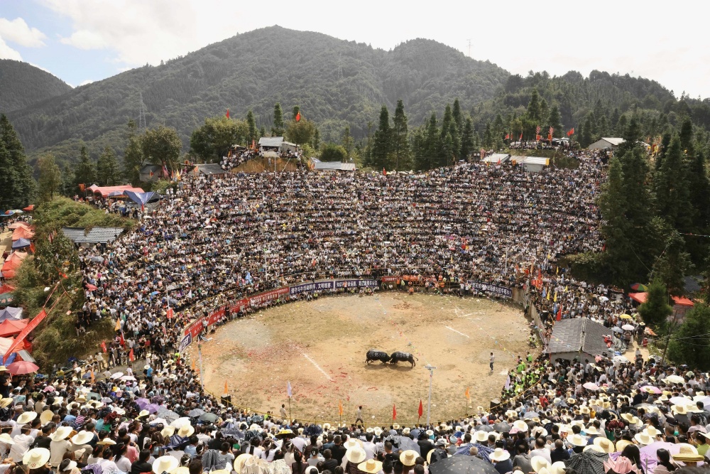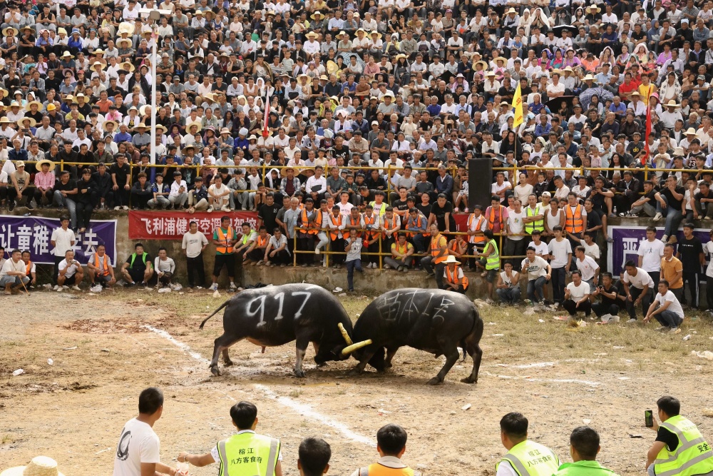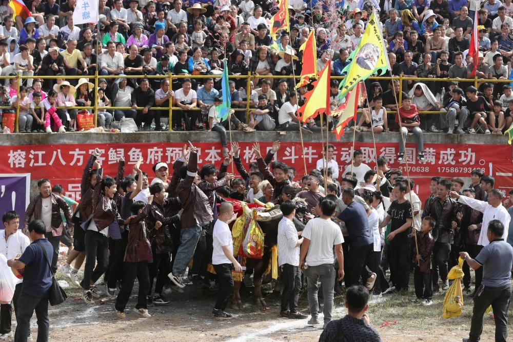 10月7日,人們在貴州省黔東南苗族侗族自治州榕江縣古州鎮(zhèn)松月斗牛塘觀看斗牛。