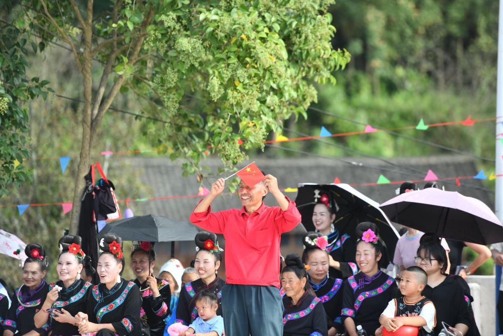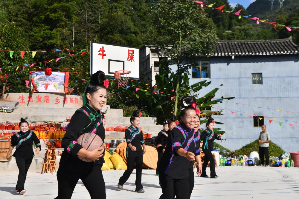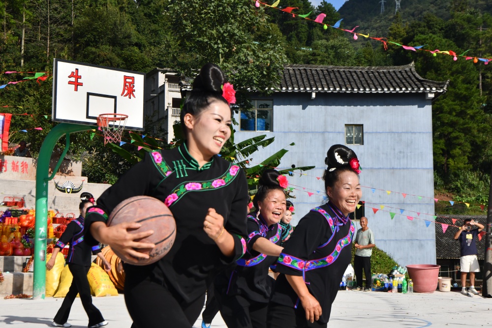 哨聲剛落,穿著黑色苗裝、額前發(fā)髻插著一朵紅花的姑媽舅媽們立馬“變身”運(yùn)動員,抱著籃球樂呵呵往籃下沖。投中一個(gè)球就有人遞上瓶礦泉水當(dāng)“彩頭”。場上跑著笑著,你搶我傳;場下老人們大吹奏蘆笙,唱苗歌,娃娃們追著球跑,歡呼聲、笑聲裹著蘆笙調(diào)飄滿山谷,整個(gè)牛屎寨成了歡樂的海洋。20分鐘比賽結(jié)束,滿頭大汗的舅媽顧榜橋還意猶未盡:“托黨和政府的福,咱農(nóng)村日子越來越甜!頭回用‘姑媽籃球賽’慶新中國76歲生日,開心得很,有意義得很!”