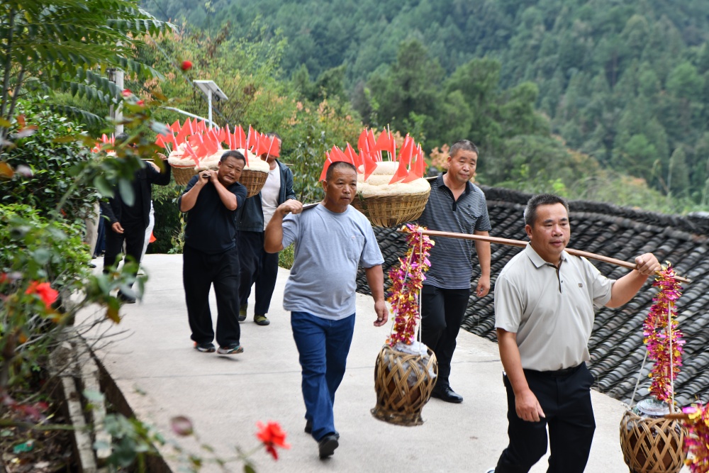 姑媽、姑爹、老表們結(jié)隊(duì)抬著肥豬、挑著糯米飯、糖果飲品,卻被舅舅舅媽們的盛情“堵”在兩道苗家攔門酒外,唱口家鄉(xiāng)的米酒,嘗口媽媽的味道,浩浩蕩蕩,依次穿過寨中間公路上用青竹搭起的半圓形拱門,彩氣球在綠葉間晃蕩,炮聲齊鳴,與苗家過年一樣熱鬧——這個(gè)地轄鴨塘街道馬安村、只有50余戶人家的苗寨,正借著球場修繕竣工的喜事兒,頭一回邀外嫁的姑媽們回娘家,過一個(gè)別樣的國慶節(jié)。