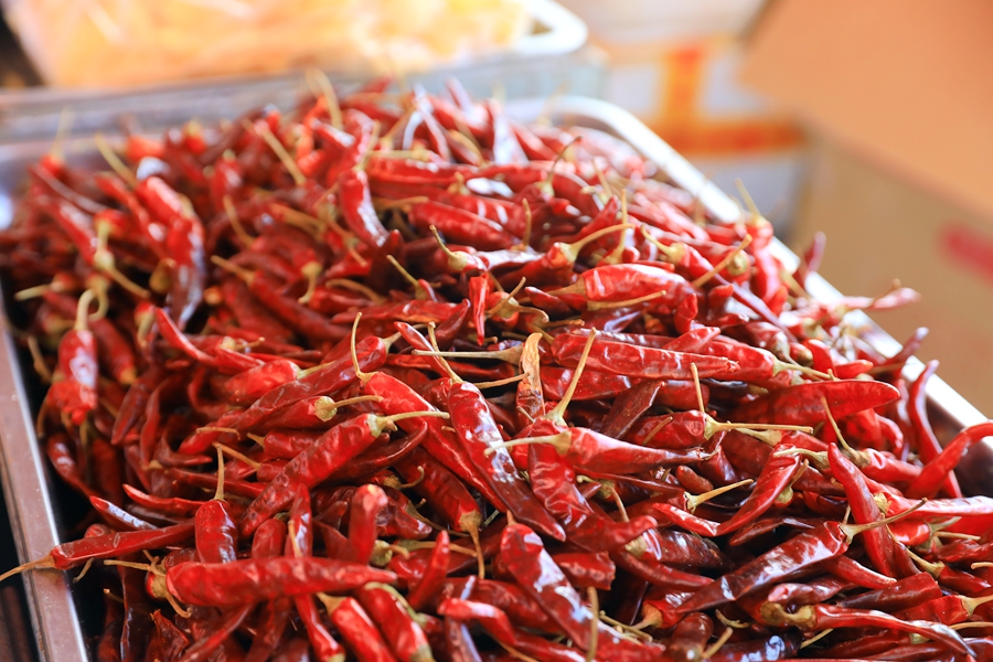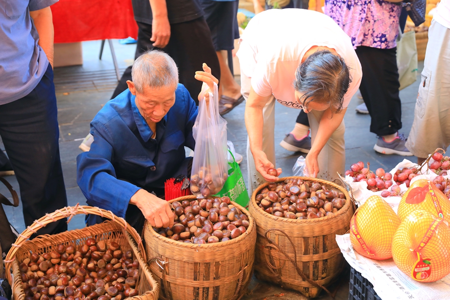 集市中段的“秋味小鋪”更顯熱鬧:攤前擺滿(mǎn)的板栗個(gè)個(gè)圓潤(rùn)飽滿(mǎn),遠(yuǎn)看像一塊褐玉,滿(mǎn)得讓人覺(jué)得踏實(shí);干辣椒擺滿(mǎn)攤位架,椒皮紅亮得泛著光,風(fēng)一吹,空氣間充滿(mǎn)了晃出的細(xì)碎椒香。前來(lái)選購(gòu)的市民黃銀蘭手提貨物,收獲滿(mǎn)滿(mǎn)?!斑@個(gè)時(shí)間段是秋收的季節(jié),我們每年都要來(lái)市場(chǎng)上挑選菌子、九月黃等,又好吃又實(shí)惠?!?/p>