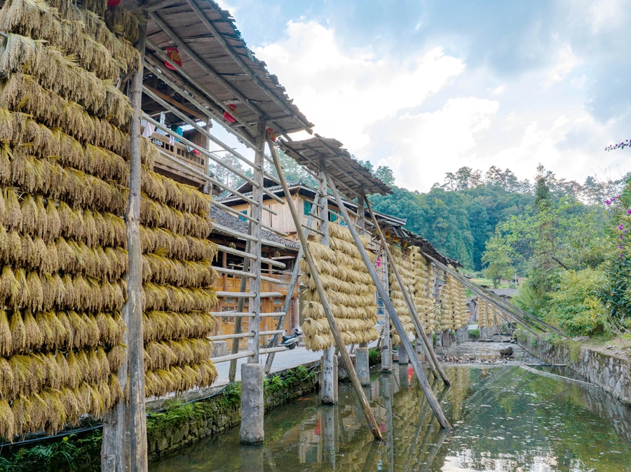 占里村自古就有禾晾“曬秋”的傳統(tǒng),如今,禾晾“曬秋”已成為當(dāng)?shù)厍锶绽锏囊粡執(zhí)厣糜蚊?,吸引游客前往觀賞。