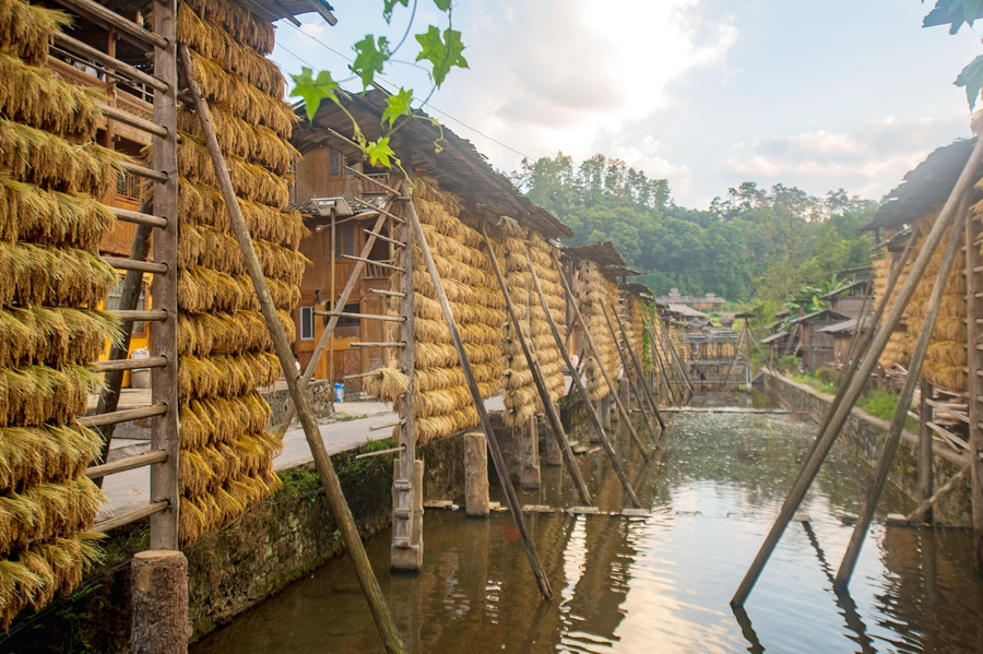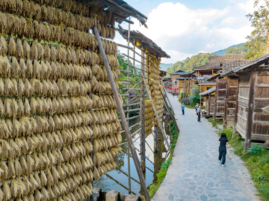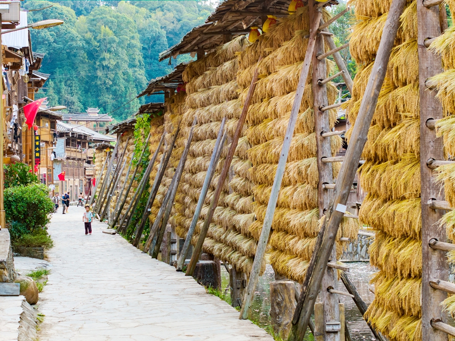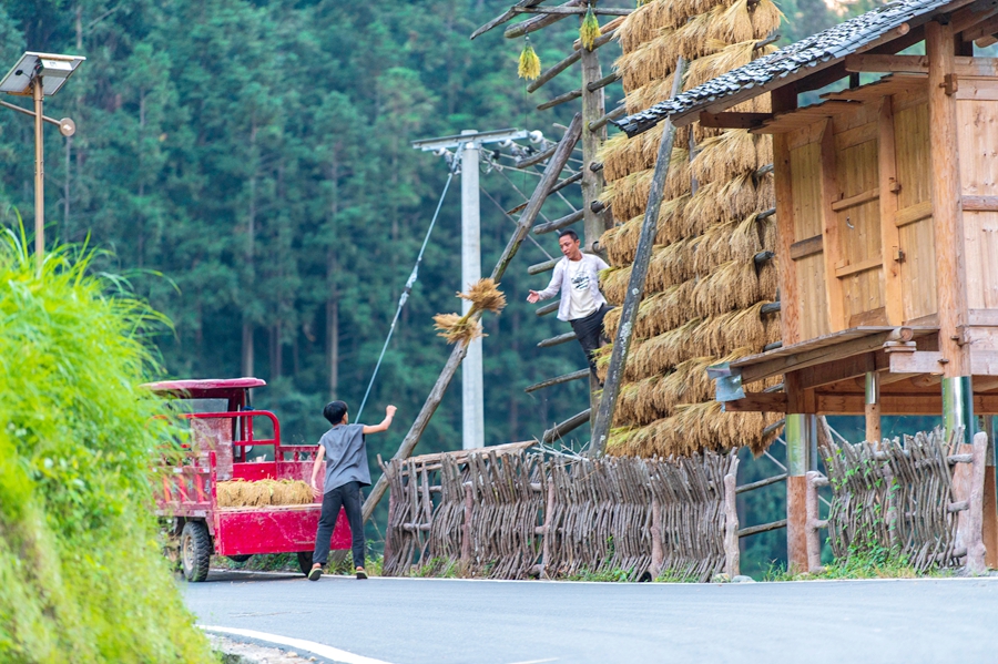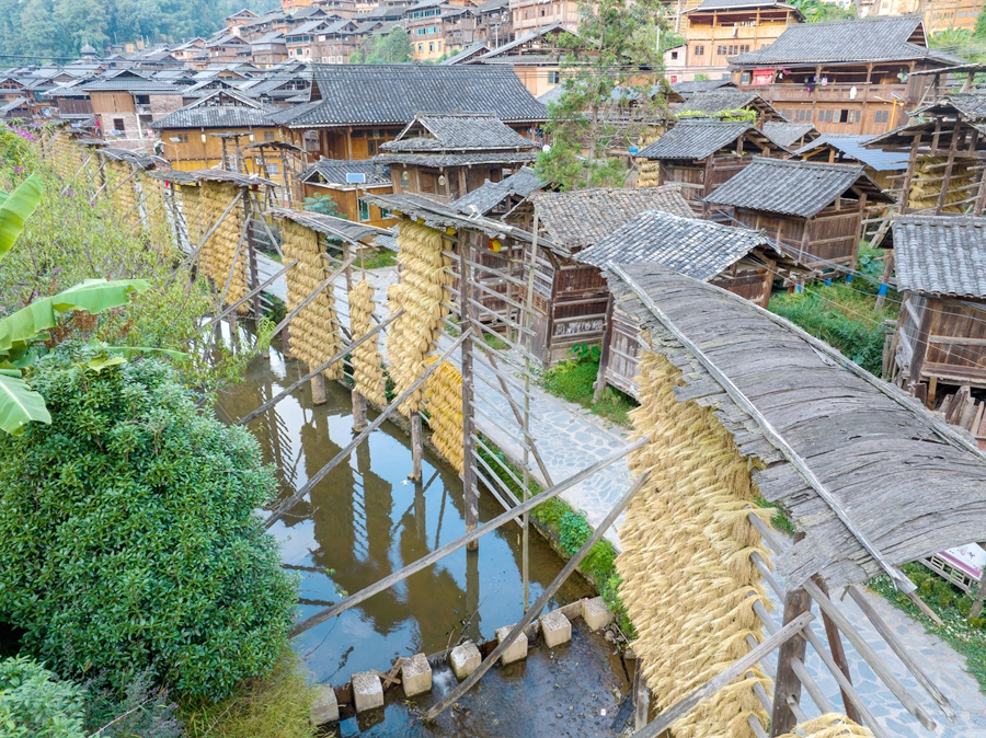 金秋時(shí)節(jié),貴州省黔東南苗族侗族自治州從江縣高增鄉(xiāng)占里村侗族村民將豐收的糯稻谷晾曬在禾晾架上,禾晾與侗寨房屋相映成景。