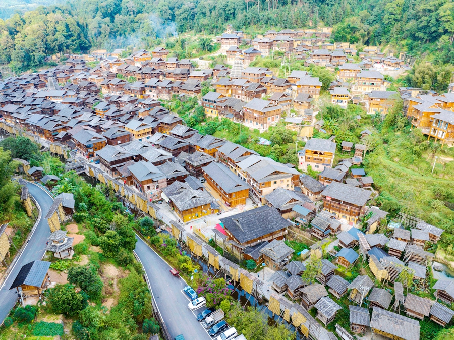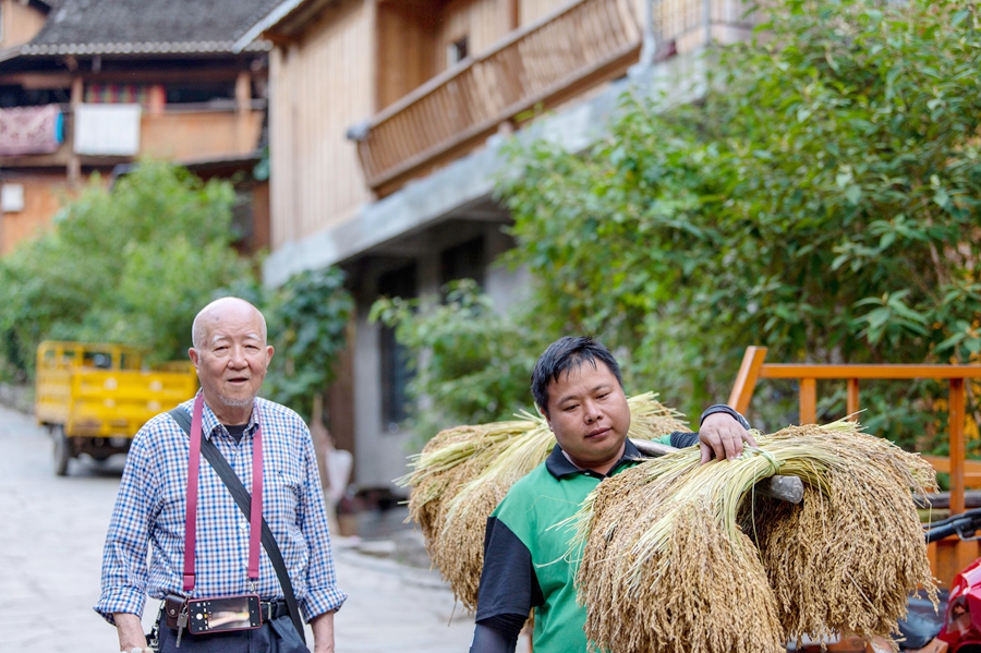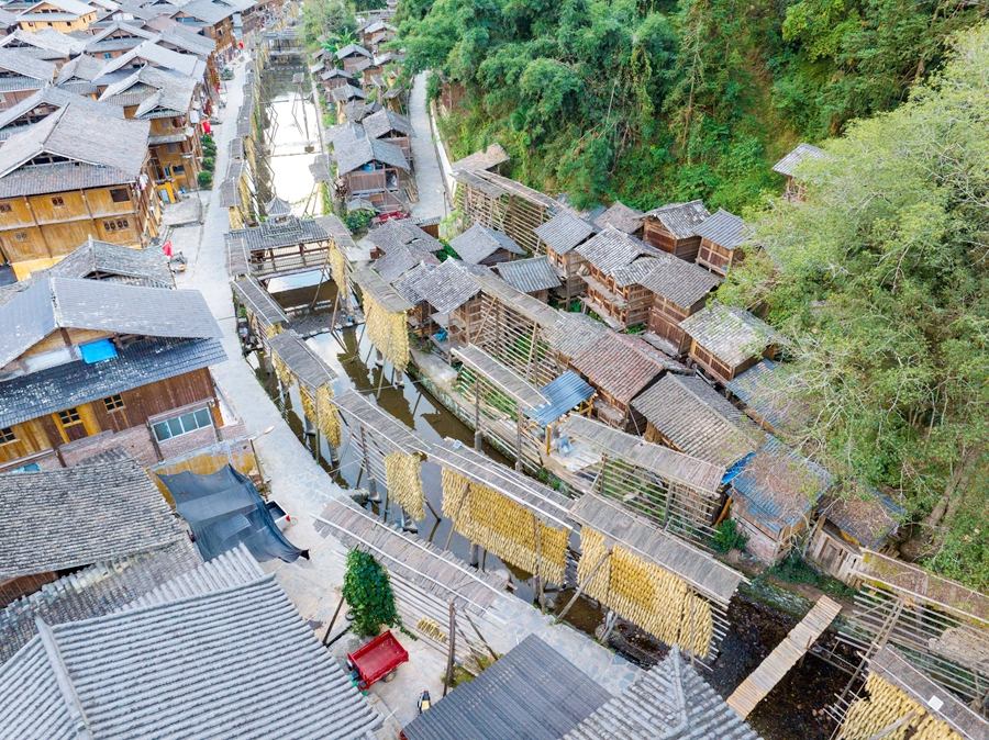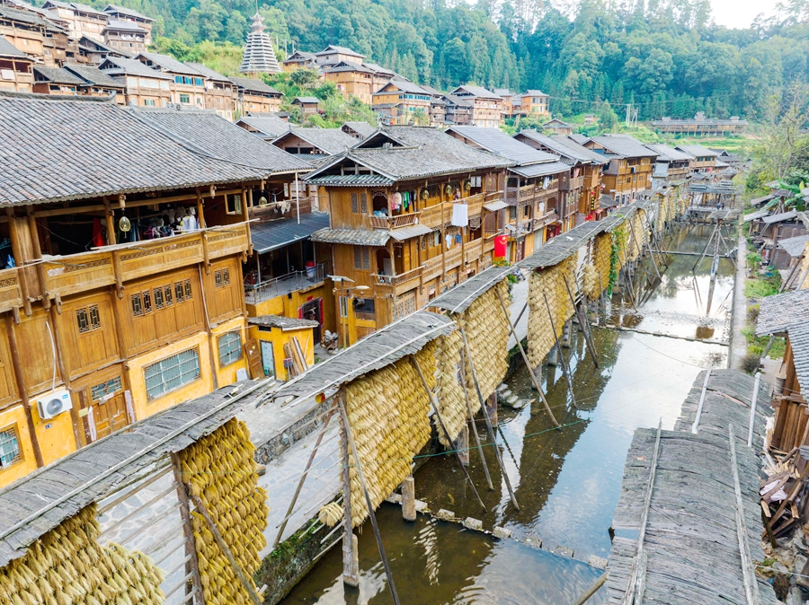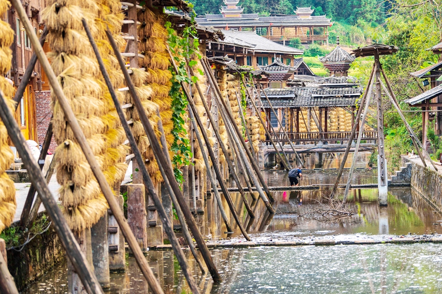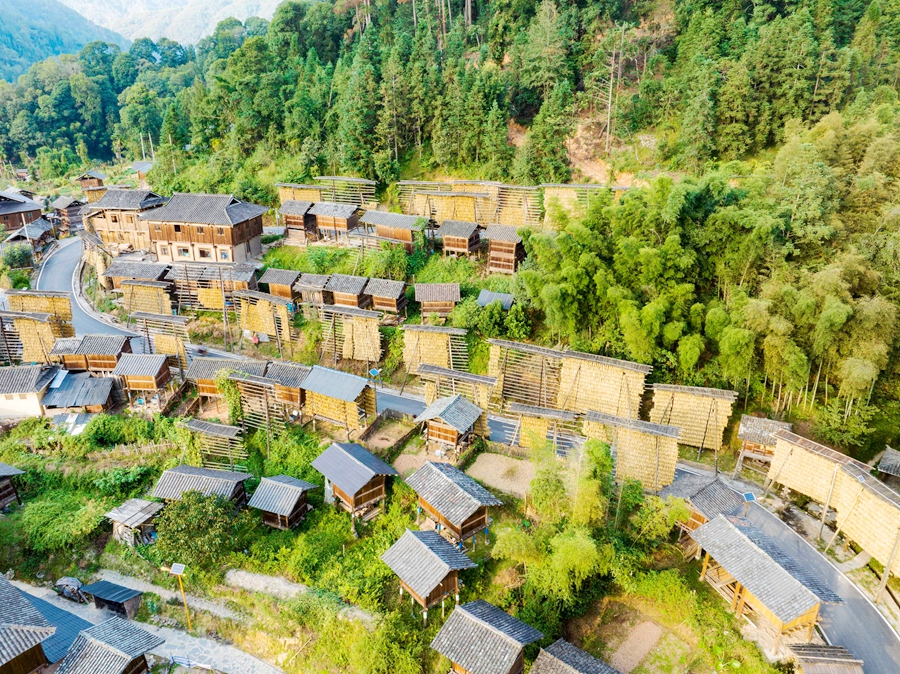 金秋時(shí)節(jié),貴州省黔東南苗族侗族自治州從江縣高增鄉(xiāng)占里村侗族村民將豐收的糯稻谷晾曬在禾晾架上,禾晾與侗寨房屋相映成景。