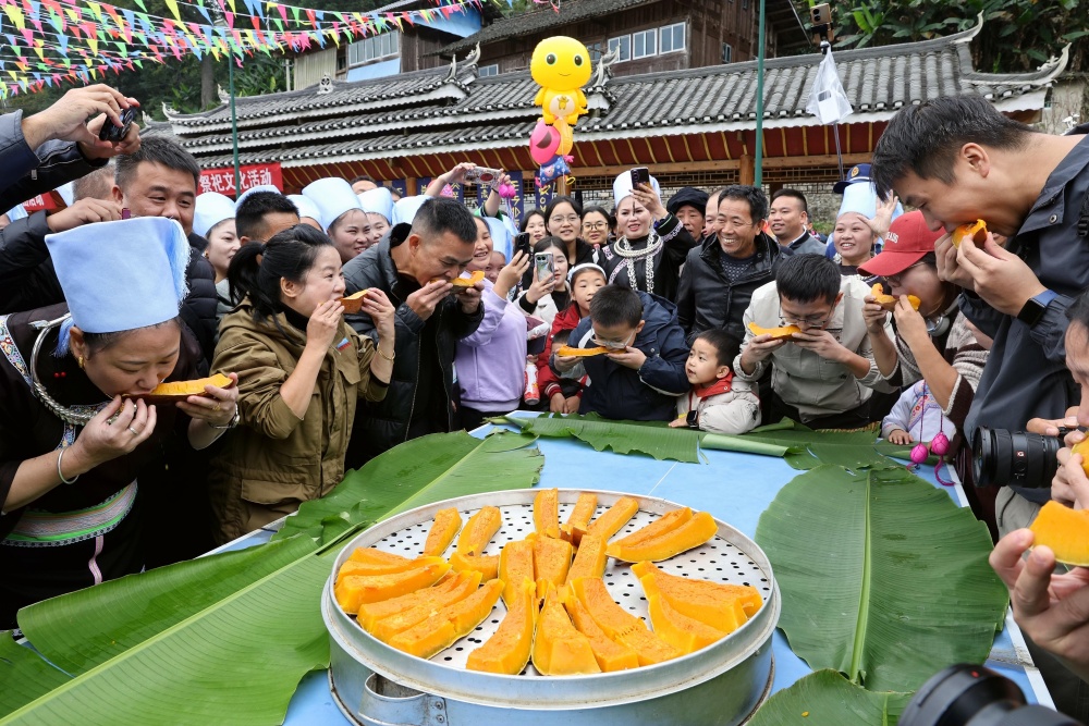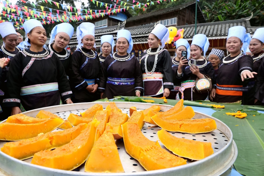 當(dāng)日,貴州省黔東南苗族侗族自治州榕江縣定威水族鄉(xiāng)亞勇村,水族同胞迎來(lái)了一年一度的瓜節(jié)。瓜節(jié)期間,她們還邀請(qǐng)周邊村寨的苗族群眾一起吹蘆笙、跳蘆笙舞、對(duì)歌、吃南瓜比賽等,載歌載舞共慶瓜節(jié)。