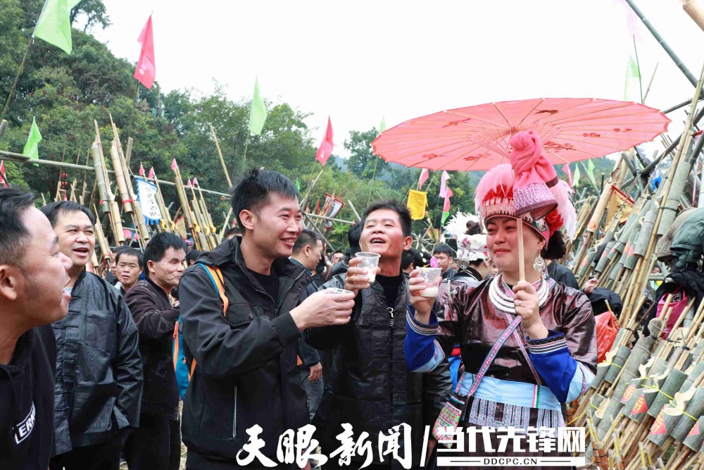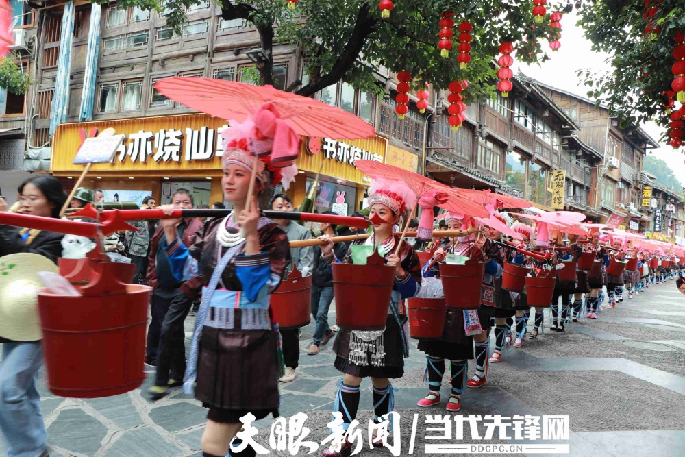活動(dòng)伊始,280名侗族姑娘身著民族盛裝,左手執(zhí)紅傘,右肩挑甜酒,組成一道流動(dòng)的風(fēng)景,緩緩走向蘆笙賽場(chǎng)。她們以侗家甜酒歡迎遠(yuǎn)道而來的賓客與參賽隊(duì)員,表達(dá)誠(chéng)摯祝福,蘆笙隊(duì)員則以糖回禮,感謝這份深情厚誼。